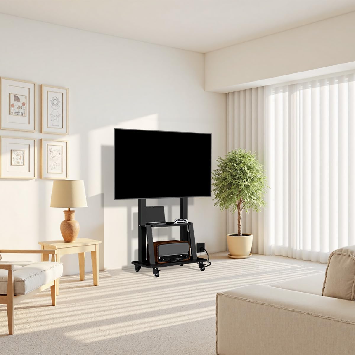 Sturdy & Compact TV Cart: Our mobile TV stand are prepared for most TV brands and types including large screen & premium TV. This TV stand with wheels fit most 32” to 75”flat screen/curved TVs with a maximum TV weight capacity of 130lbs, plus safety screw as an additional security. Dual-tier storage design can hold up to an remarkable 66lb upper shelf and 110lb lower shelf for your equipment, provides a stable and safe platform for laptops, media players, sound bar, and game consoles.