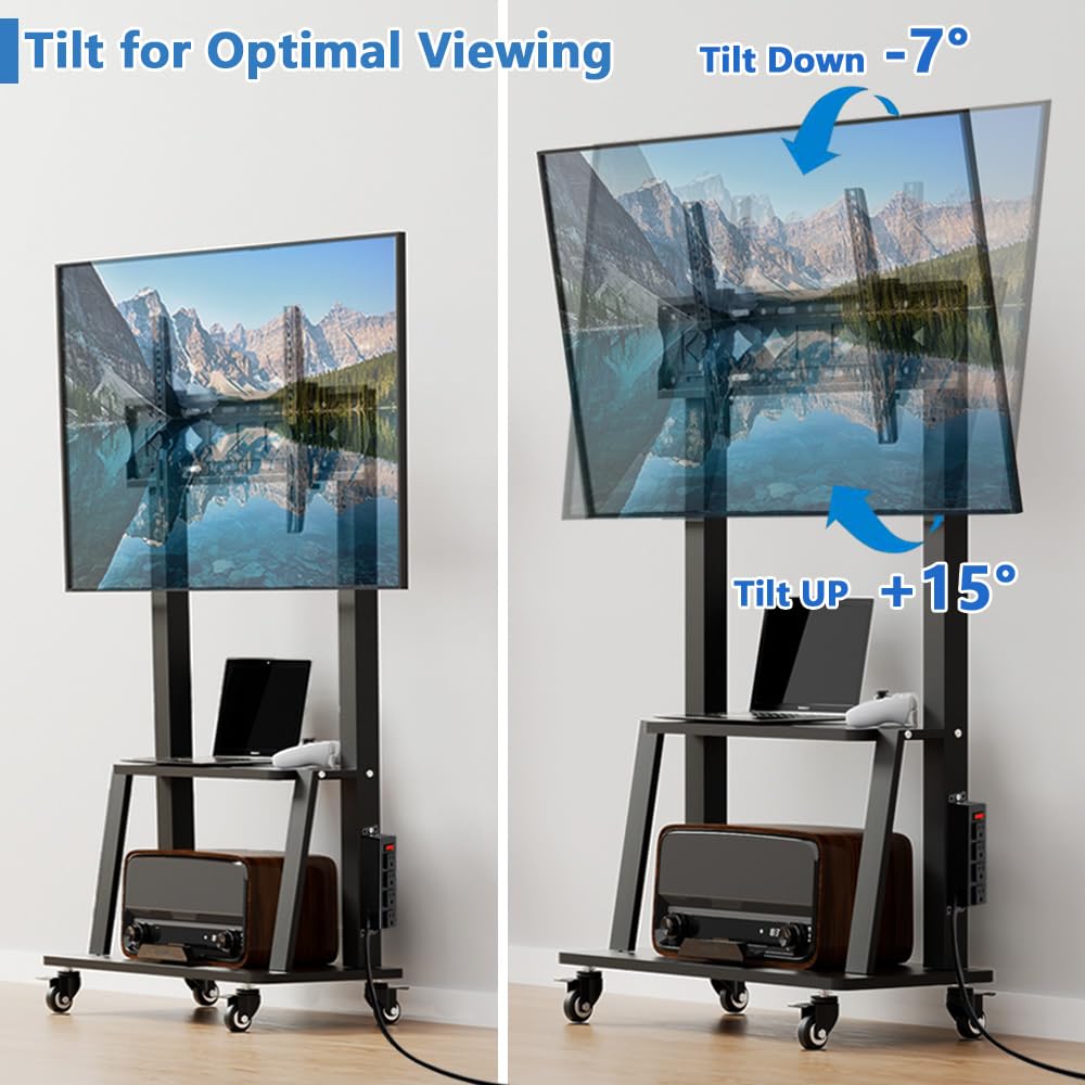 Portable TV stand with Power Outlet: This Duiliuu TV cart is equipped with a built-in power outlet with 4 AC outlets (125V/12A) and a 6.5 ft power cord for easy connection to a wall outlet to say goodbye to messy wires, and a one-button switch that turns it off when not in use, which can prevent children from touching it and other problems effectively.