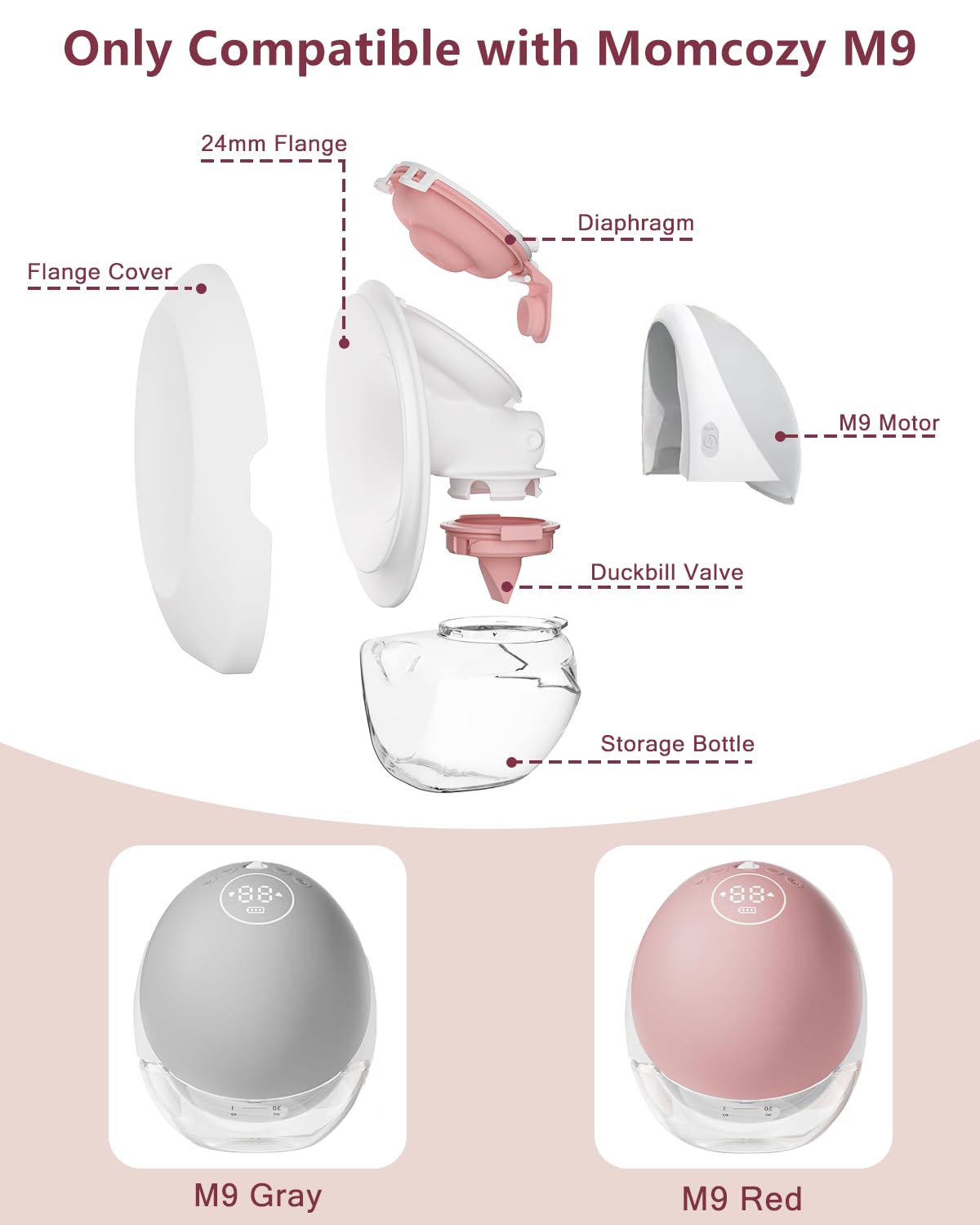 【Perfectly Fit for Upgrade M9】:Two M9 overall full set parts only compatible with Momcozy Upgraded Mobile Flow | M9, not for other breast pump. M9 full breast pump including 2pcs X 24mm flange, 2pcs X Red duckbill valves, 2pcs X Red diaphragms, 2pcs X Storage bottles. Made by BDICOVE, Not Mom cozy Original Parts.