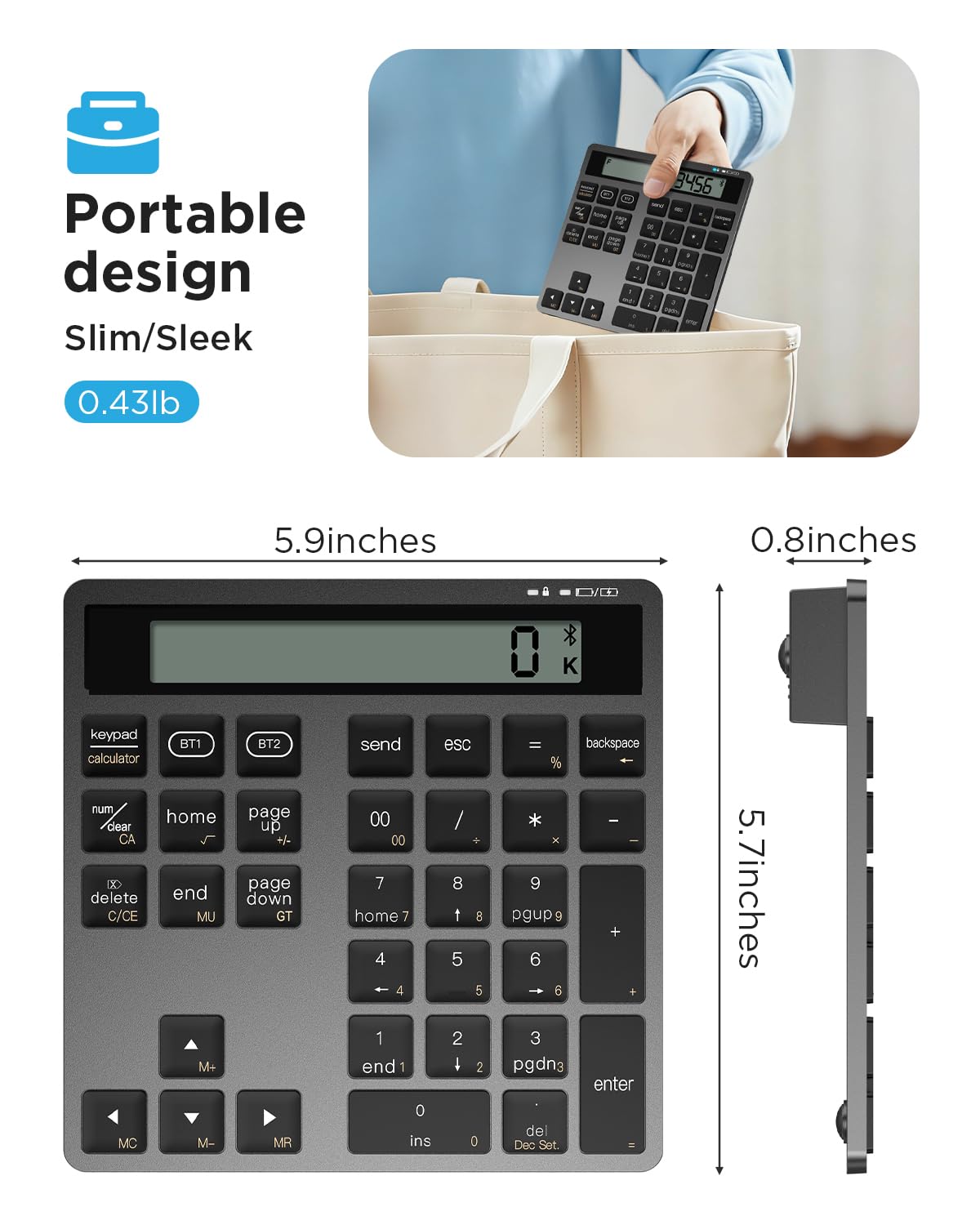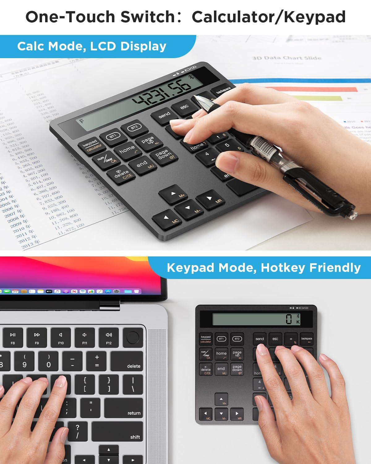 🔋 Rechargeable & Eco-Friendly Design No more disposable batteries. This Bluetooth number pad features a built-in rechargeable lithium battery (USB-C charging cable included). Fully charged in just 2.5 hours, it delivers up to 120 hours of continuous use or 100 days standby time—perfect for business travel and daily use.