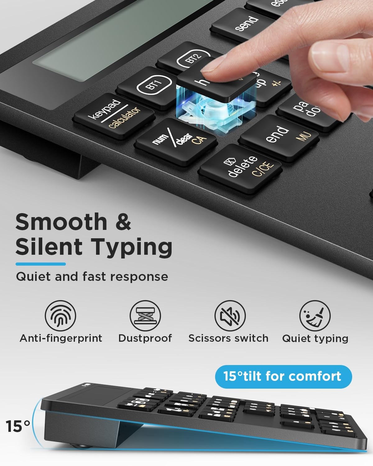 🔇 Quiet Typing with Scissor-Switch Keys Premium low-profile scissor-switch keys provide tactile feedback with quiet keystrokes—perfect for shared or quiet workspaces. Ergonomic 15° tilt design improves typing posture and comfort during long sessions.