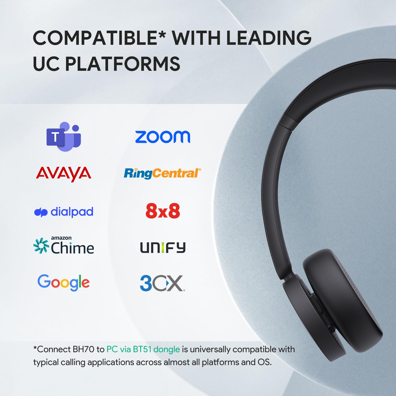 Brilliant Audio Quality ▶ The BH70 also has excellent voice reception capabilities, any factors that may lead to increased distortion or blur are avoided. Whether you're in a busy office environment or on-the-go, the BH70 ensures that your calls are clear and professional. On the other hand, when it comes to music mode, BH70 headphones use dynamic EQ adapts to different genres of music to deliver an immersive audio experience with rich bass, detailed midrange tones, and crisp highs.