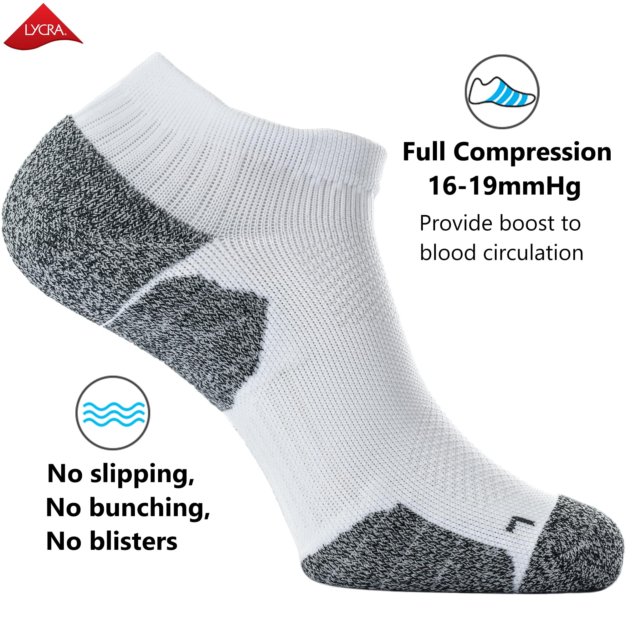 COMPRESSION FIT: Short socks with targeted compression (16-19 mmHg) to provide boost to your blood circulation, anti-swelling, arch support, fit your feet perfectly and no slipping, no bunching, no blisters
