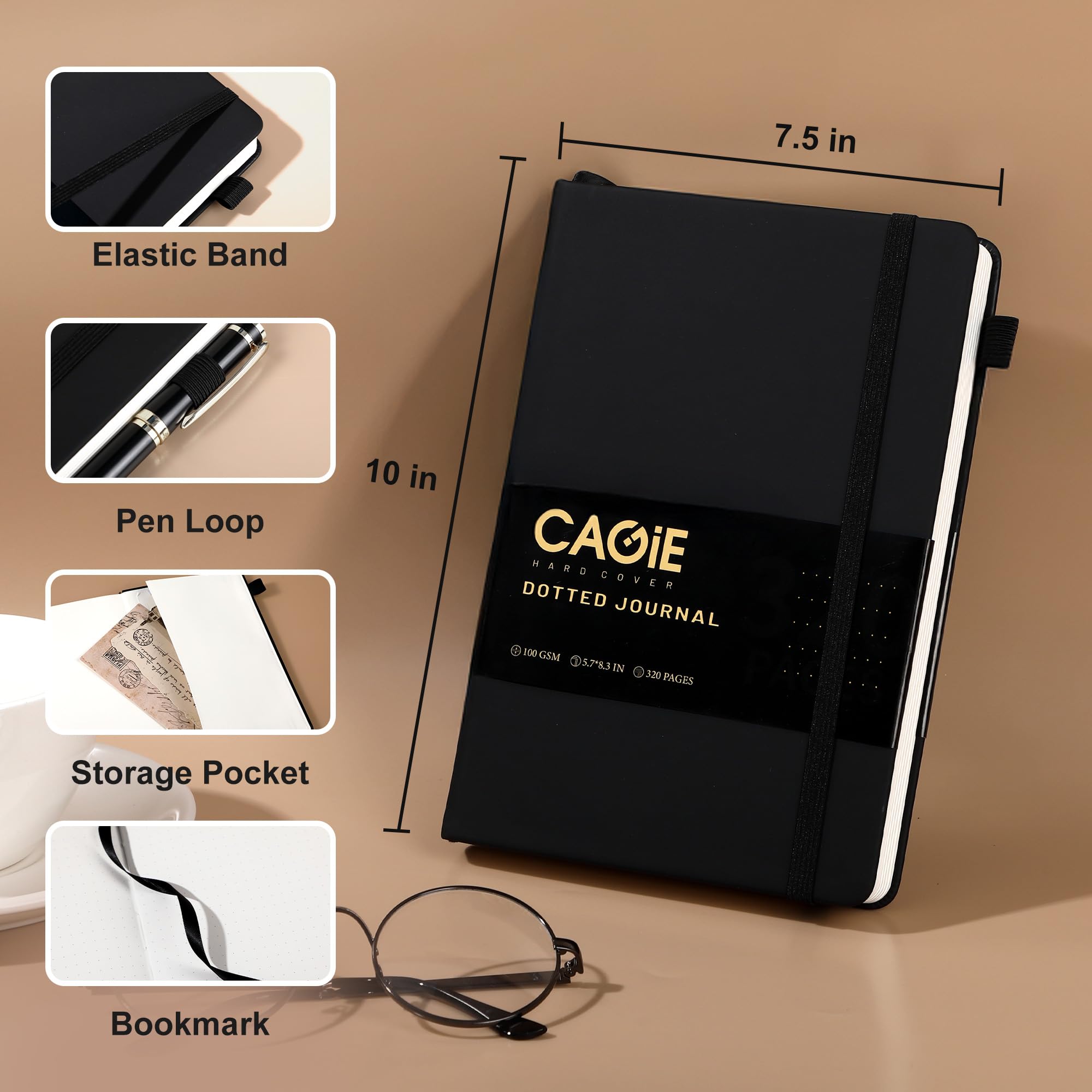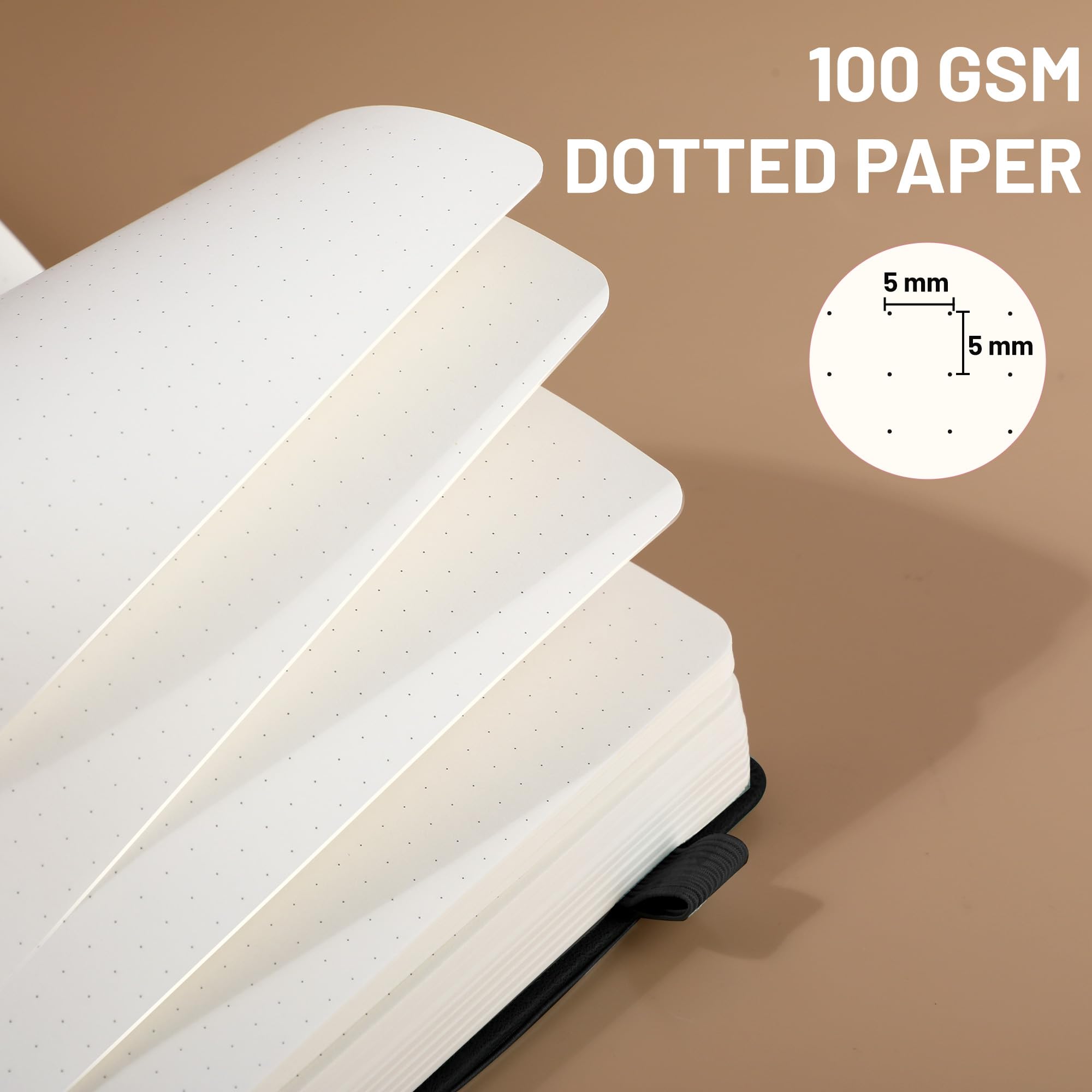 BULLET DOTTED JOURNAL- A5 dotted notebook features 314 pages with 6 pages of contents. Inside, 5mm × 5mm dot paper are complemented by a durable vegan leather hardcover, storage pocket, ribbon bookmark, and elastic closure band