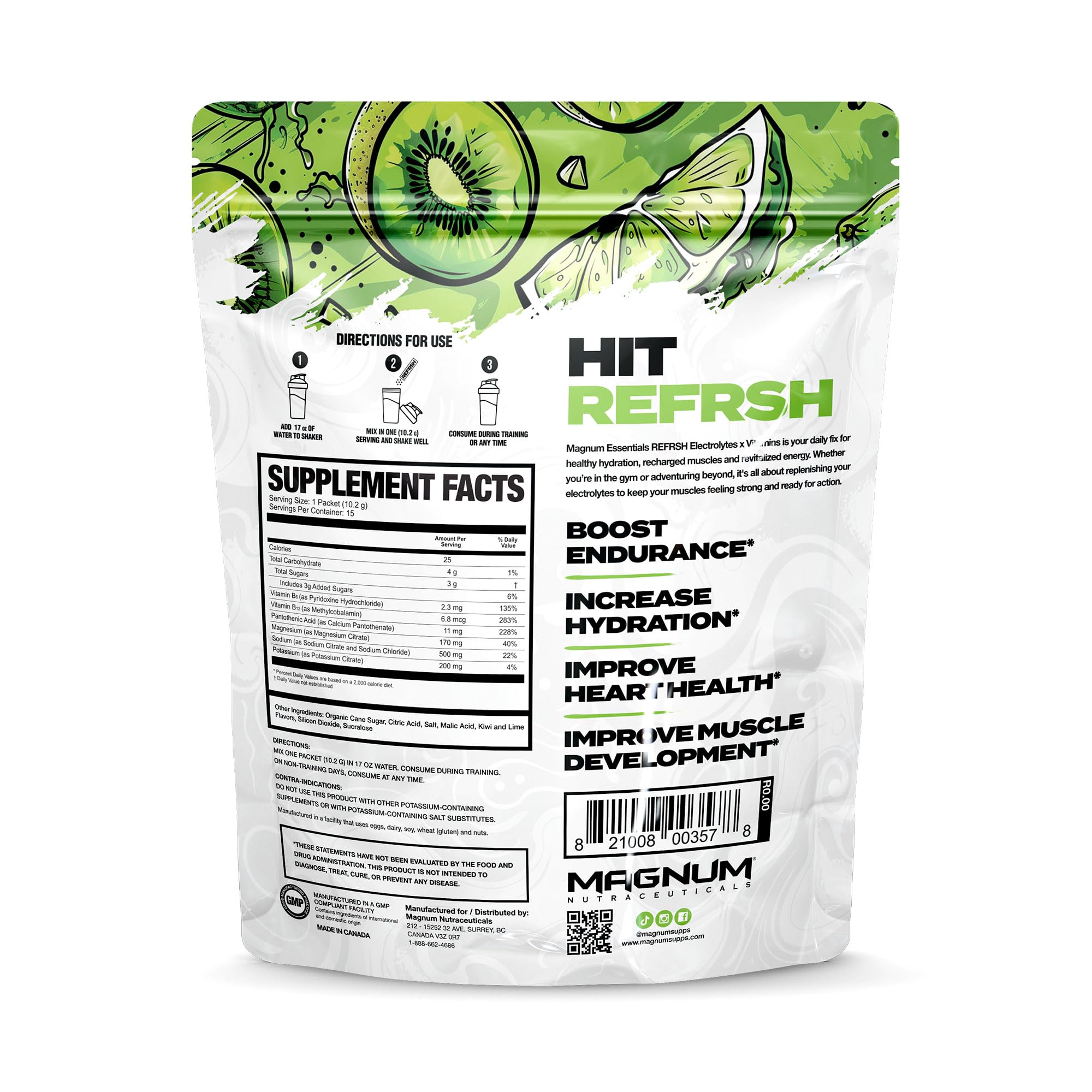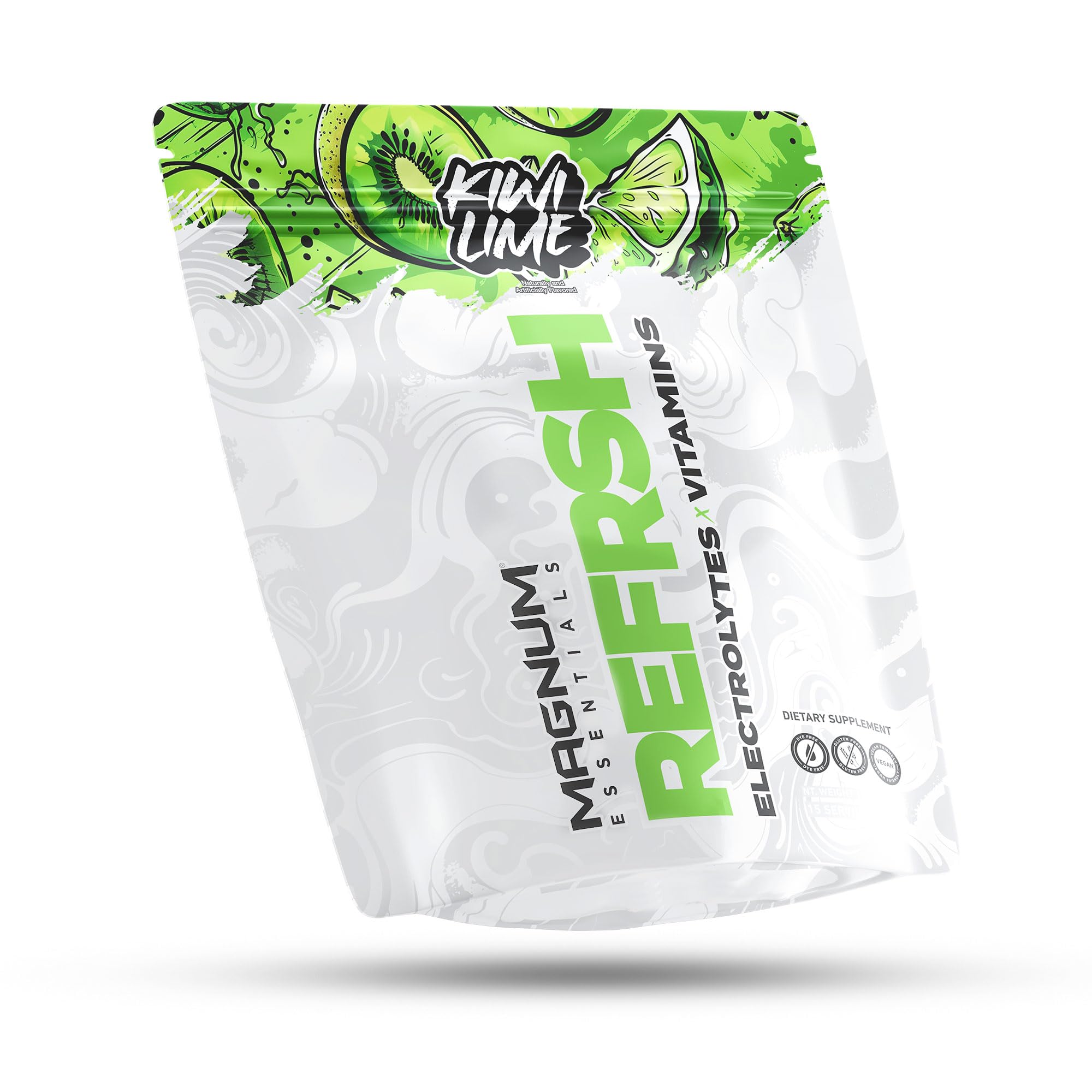 Stay cool and hydrated with NEW Magnum Essentials REFRSH Electrolytes x Vitamins. Our healthy hydration blend delivers the ultimate in easy refreshment and replenishment for busy days on the move. Wherever and whenever you need to HIT REFRSH. Our new resealable gusset bag contains individual portion packets ideal for on-the-go hydration. Available in three mouthwatering flavors: Double Mango, Kiwi Lime and Watermelon.