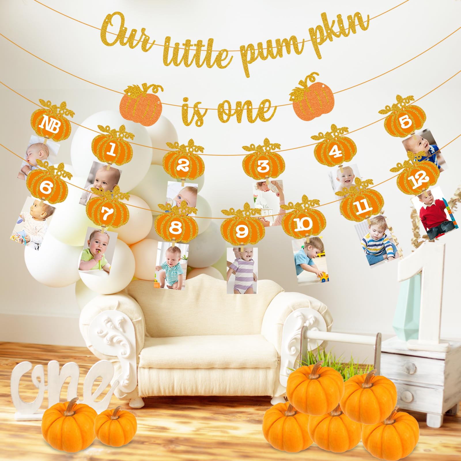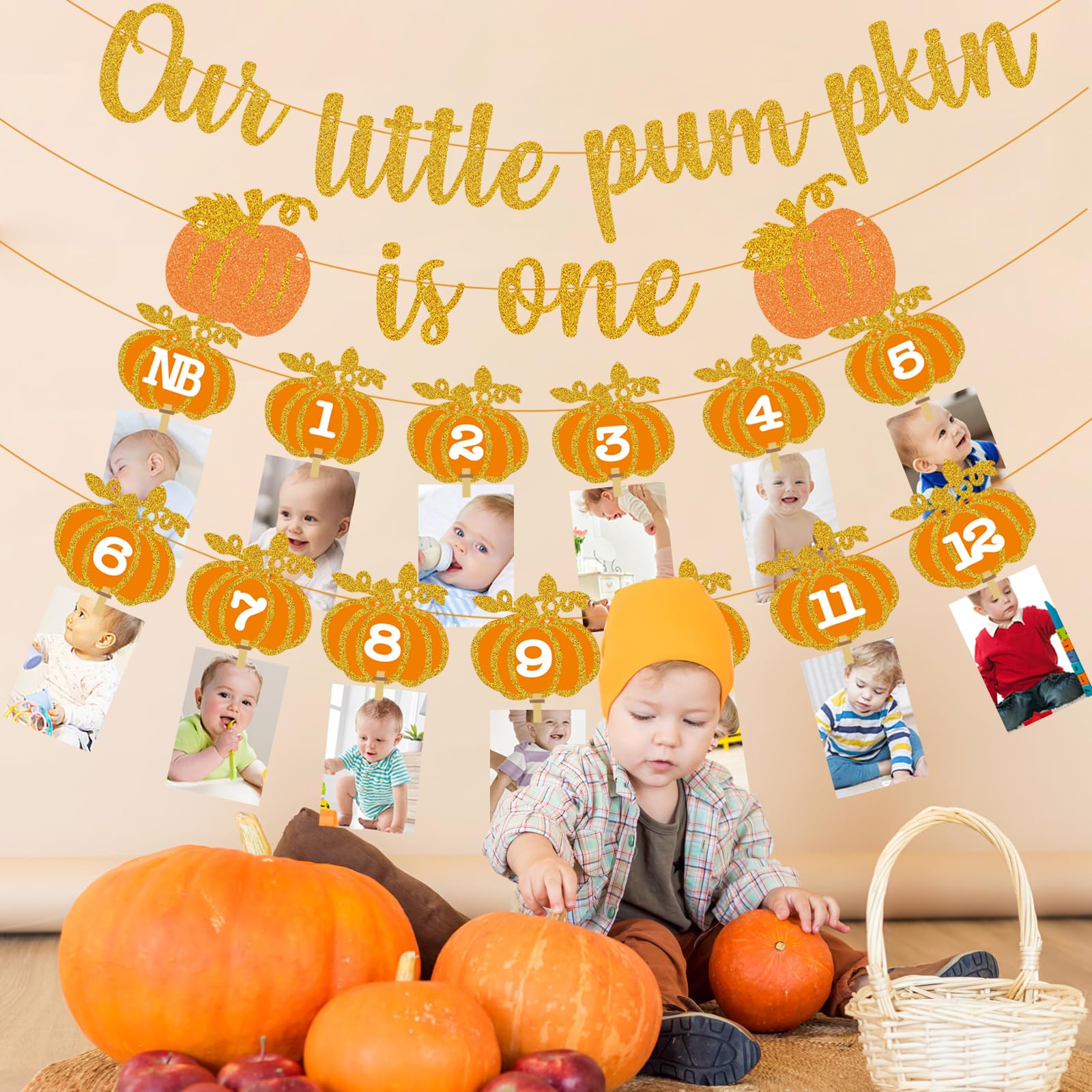 Package Contents: Package includes "OUR little pumpkin is one" pull banner, 1 set of 1st birthday photo banners from newborn to 12 months, including 13 small wooden clothespins (for hanging photos), 1 roll of string for hanging pull banners