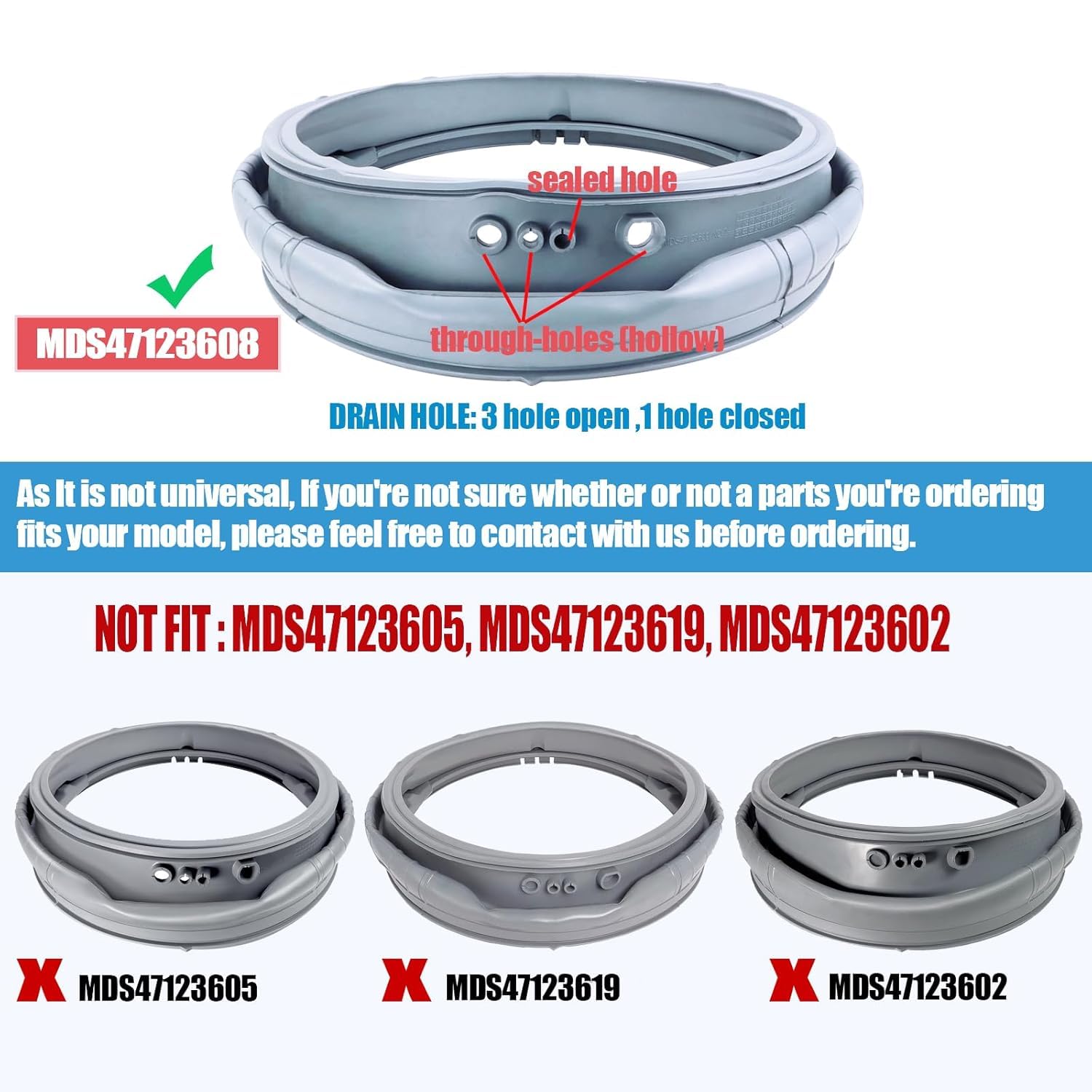 โ๏ธใFunctionใThe Door Boot Seal forms a seal between the wash tub and the door, prevent leaks. MDS47123608 Washer Door Boot Replaces AP5668418, PS6448330, 2673936. Before purchasing, please check whether the part number you need is correct, ensure it is suitable for your washing machine model. NOTE that some models require you to open the drain hole with scissors.