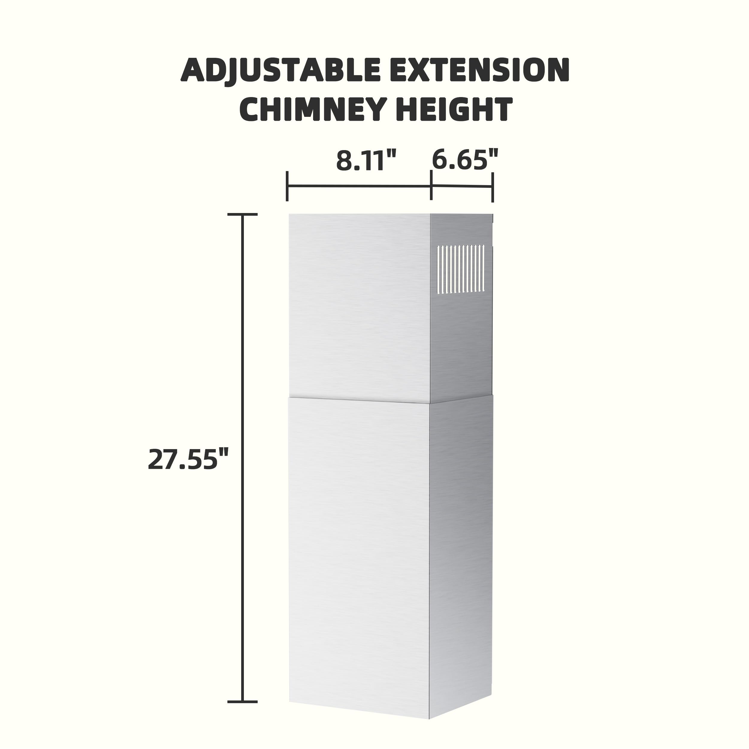 PRODUCT DIMENSION:8.11"(W) x 6.65"(D) x 27.55"(H), the kitchen hood chimney height is adjustiable. Add this extended chimney to the original range hood and chimney which can extend to 9 to 10 inch high ceilings