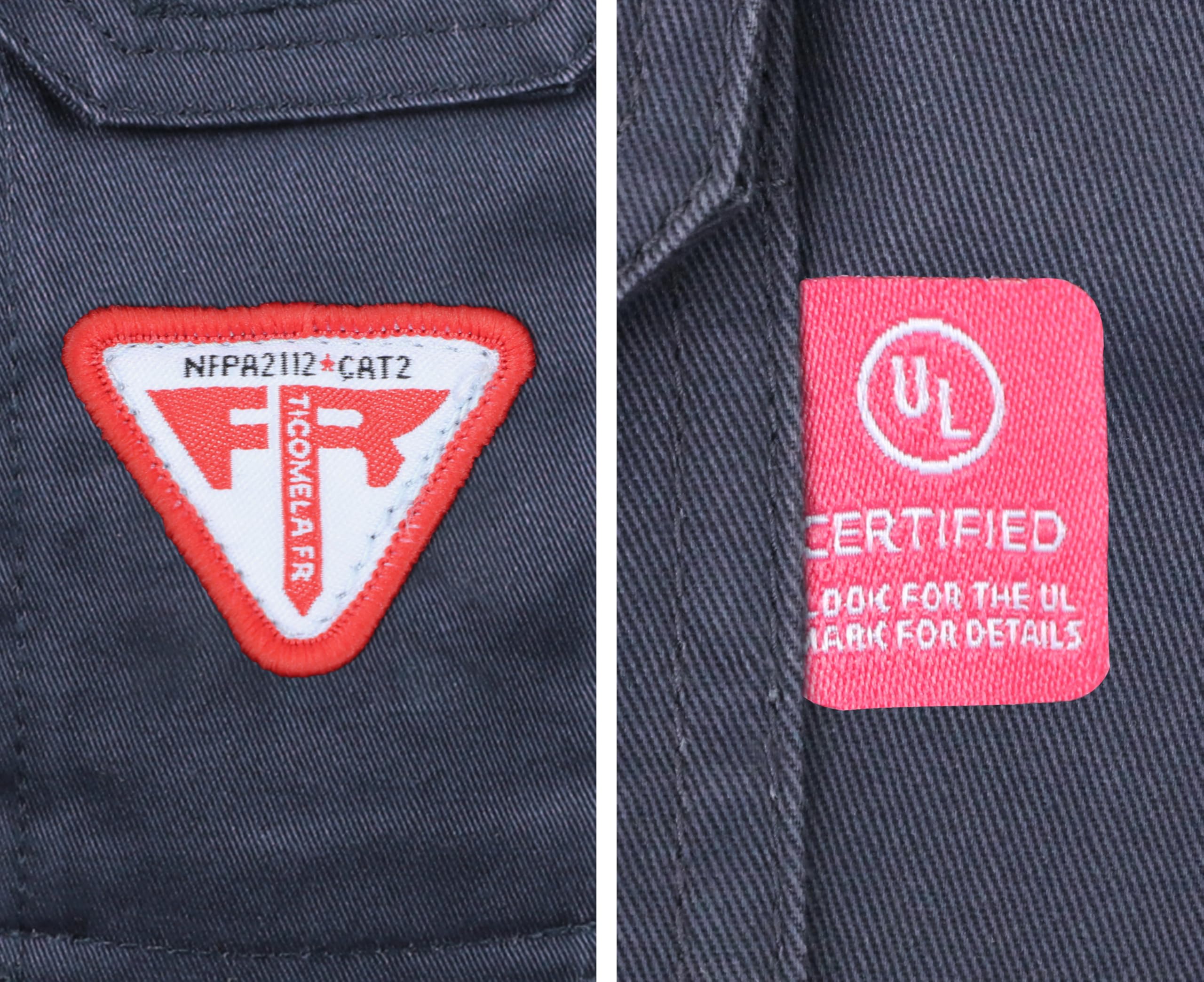 FR MATRIALS:7.5OZ Cotton Twill FR Treated,FR Buttons,FR Sewing Threads!Clear FR Tag on Phone Pocket front.More FR info On Neck Tag About UL Certification.We Attached A Small Sample Inside Package For Cunstomers Simple FR Try