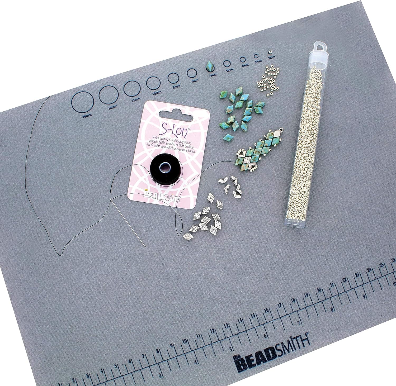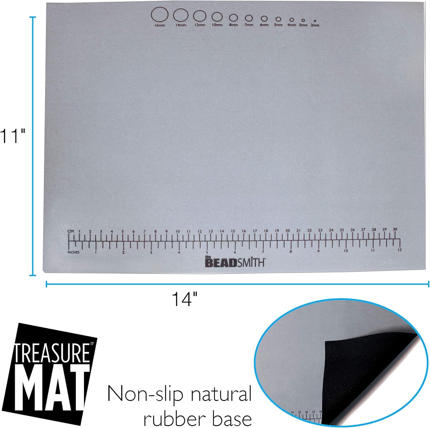 The Treasure Mat is brought to you by The Beadsmith. This durable padded beading mat is made of a non-slip, natural rubber base and a durable padded surface. The top of the mat is soft, which helps prevent beads from rolling around! The mat has laser printed measurements on the surface. One side are round bead diameters, a visual guide of bead sizes from 2mm to 16mm. This is a nice feature when you have many pieces on your mat and you need to keep a bead as reference when writing down instructions for your newest masterpiece. The other side is a very handy ruler, which makes measuring quick and easy while working on projects. Measurements are conveniently listed in both inches and centimeters. The mat is completely flat and functions as a general work surface. It is available in two sizes: 11 x 14 inches and 12.5 x 9.25 inches. There are sold in two different hangable put ups. The mats are excellent for seed beads or other craft projects where a bead board is not required, and you need more room to spread out. The large size will accommodate tools and accessories as well as your project. This is a great addition to your storage supplies kits.