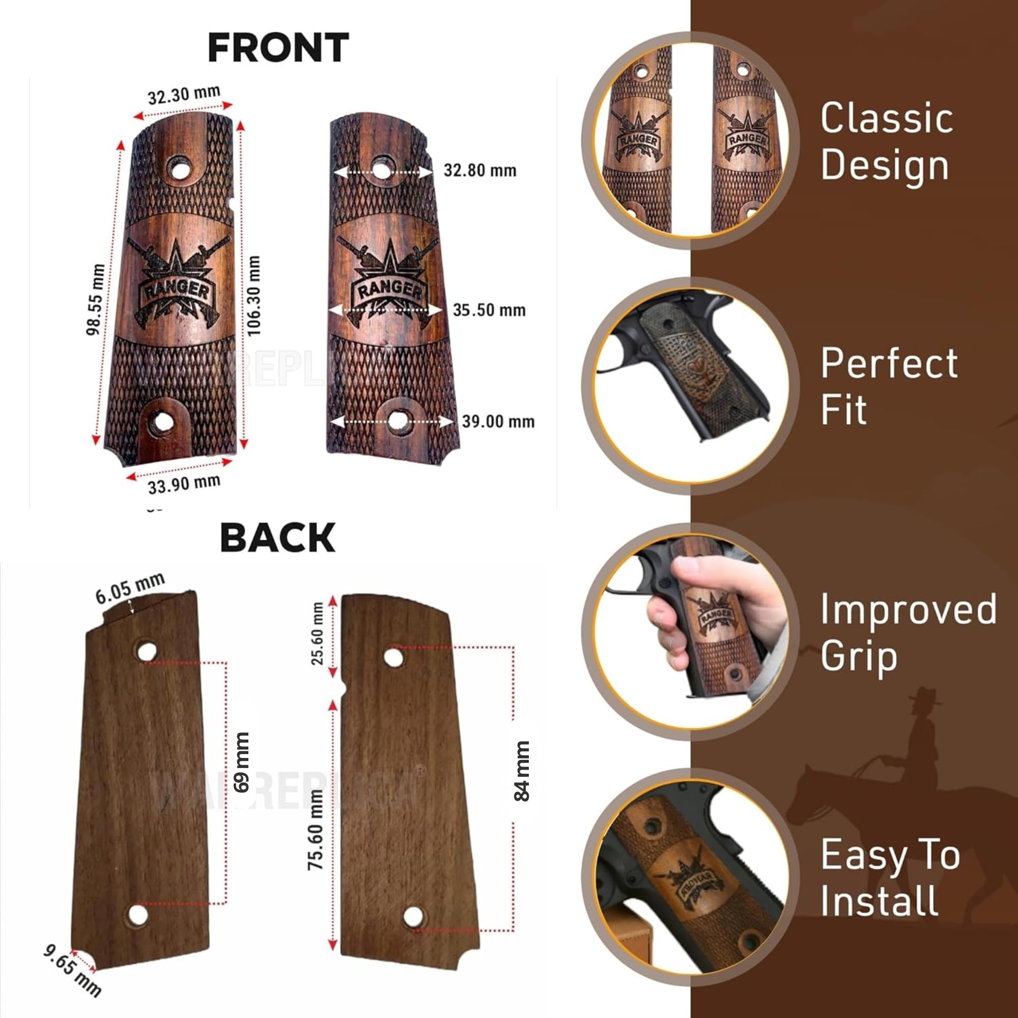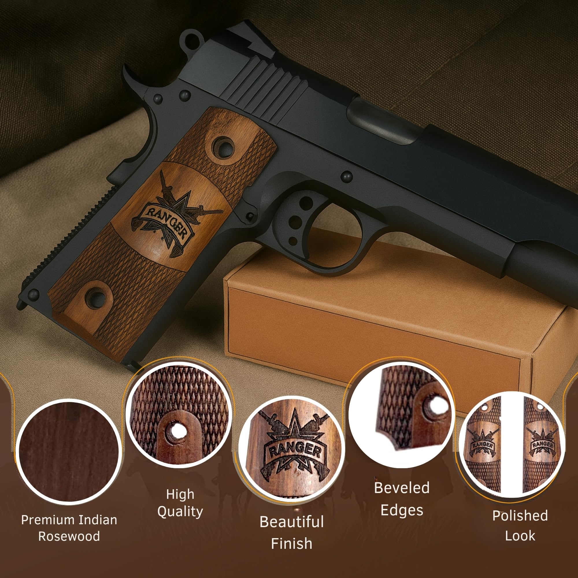 IMPROVED GRIP: The wooden material of these grips provides a natural grip that enhances your control and accuracy when firing your M1911/1911 .45. The improved grip helps reduce recoil and enhances your ability to maintain a steady aim, making them perfect for shooting enthusiasts.