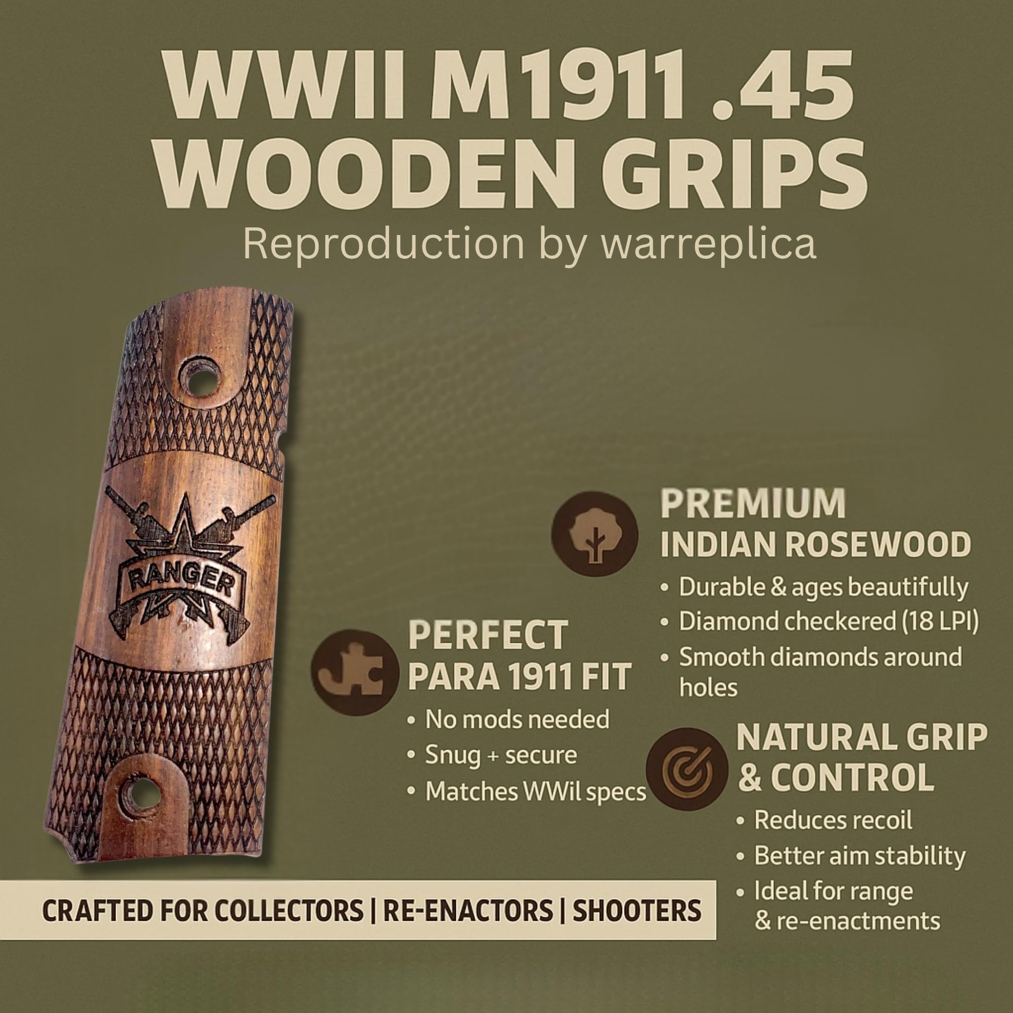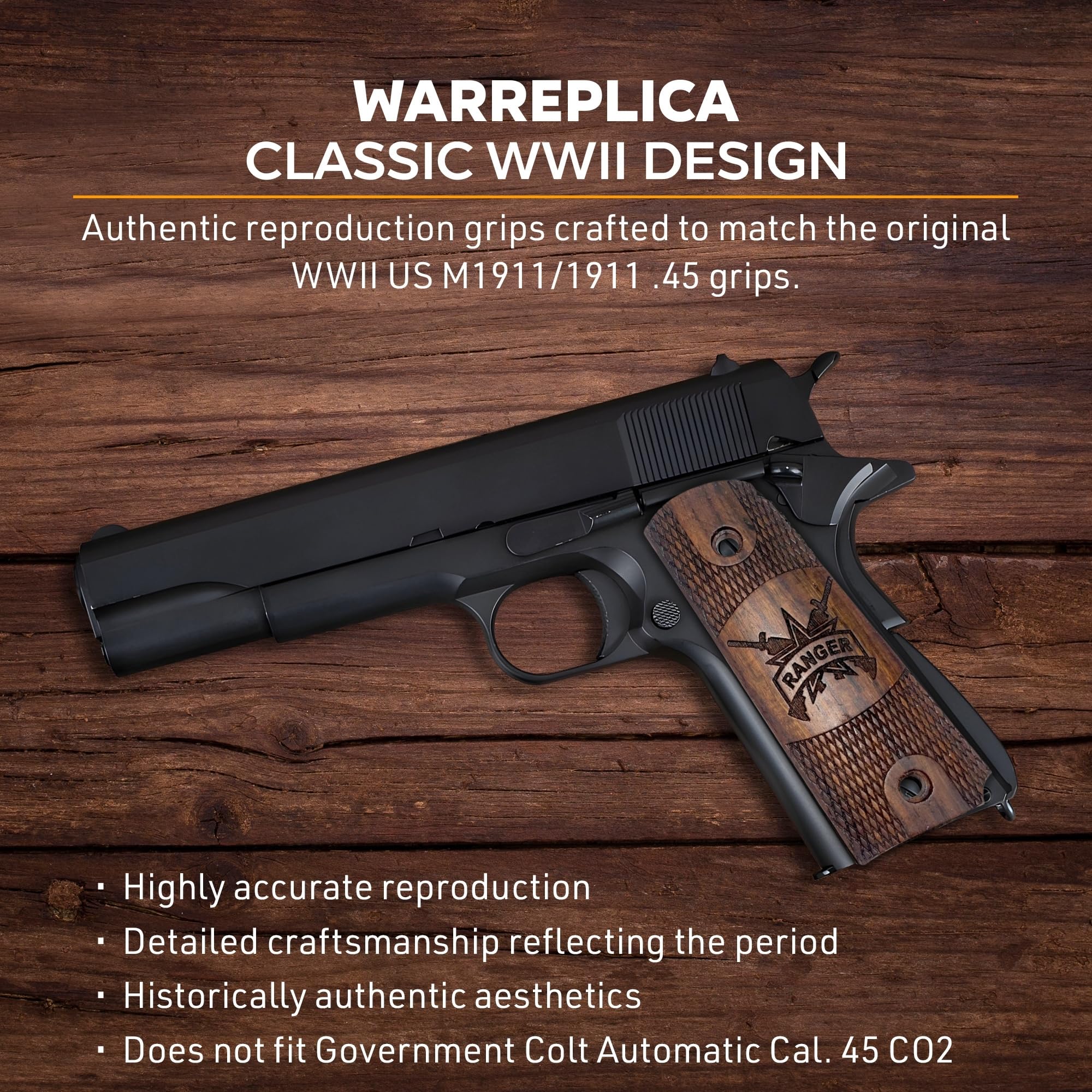 CLASSIC DESIGN: These wooden grips for the WWII US M1911/1911 .45 are meticulously crafted to provide a highly accurate reproduction of the original grips used during World War II.