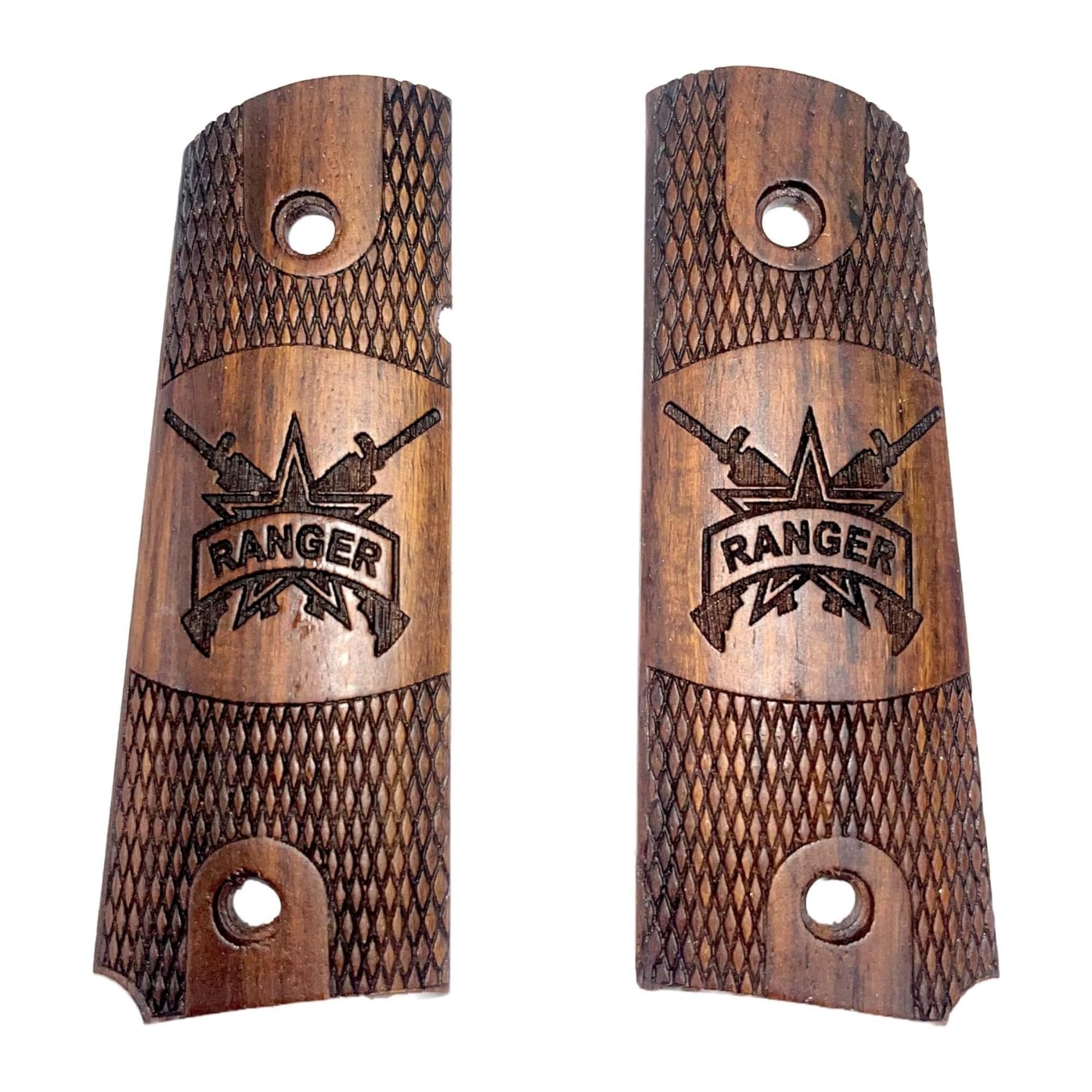 MATERIAL: The grips are Indian Rosewood wood (Scientifically Dalbergia Sissoo). Handsome, distinctive, hard wood 1911 Auto grip panels, precision shaped and carefully matched reproduction. Top quality hardwoods become even more beautiful with age. Inletted for safety, with cutouts for mainspring housing pin, and bevelled bottom edges give a neat, finished appearance. Diamond Checkered, 18 LPI checkering, broken by smooth diamonds at the grip holes.