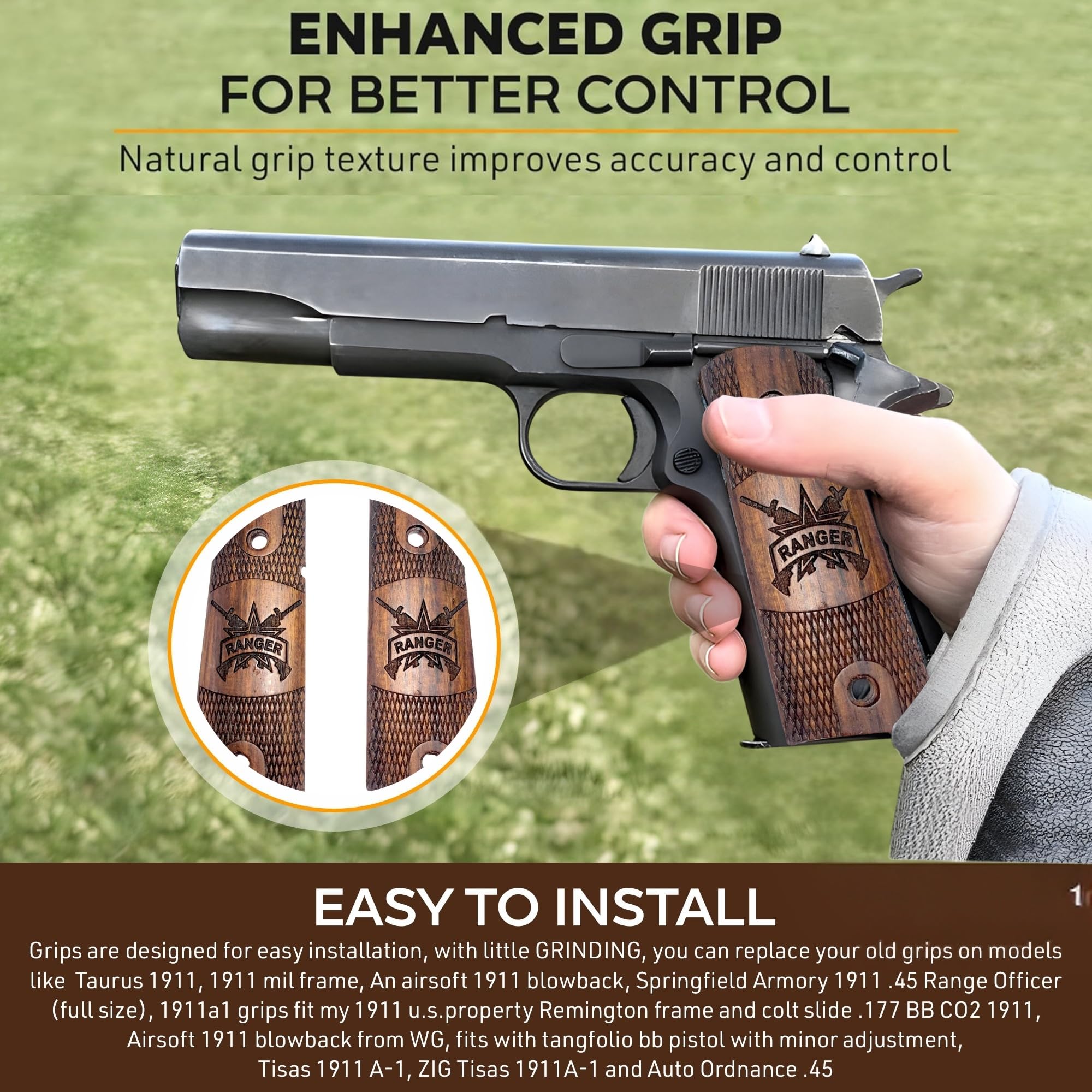EASY TO INSTALL: Grips are designed for easy installation, with little GRINDING, you can replace your old grips on models like Taurus 1911, 1911 mil frame, An airsoft 1911 blowback, Springfield Armory 1911 .45 Range Officer (full size), 1911a1 grips fit my 1911 u.s.property Remington frame and colt slide .177 BB CO2 1911, Airsoft 1911 blowback from WG, fits with tangfolio bb pistol with minor adjustment, Tisas 1911 A-1, ZIG Tisas 1911A-1 and Auto Ordnance .45