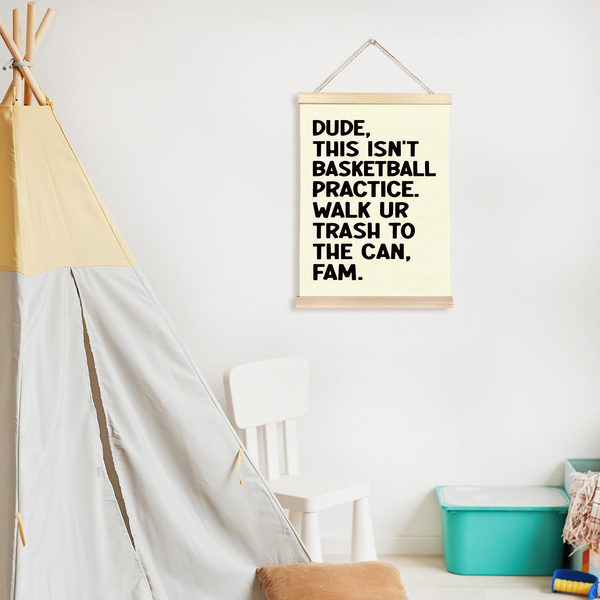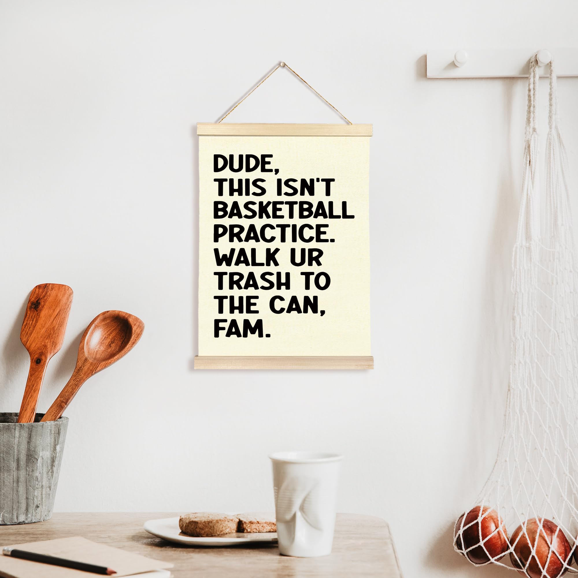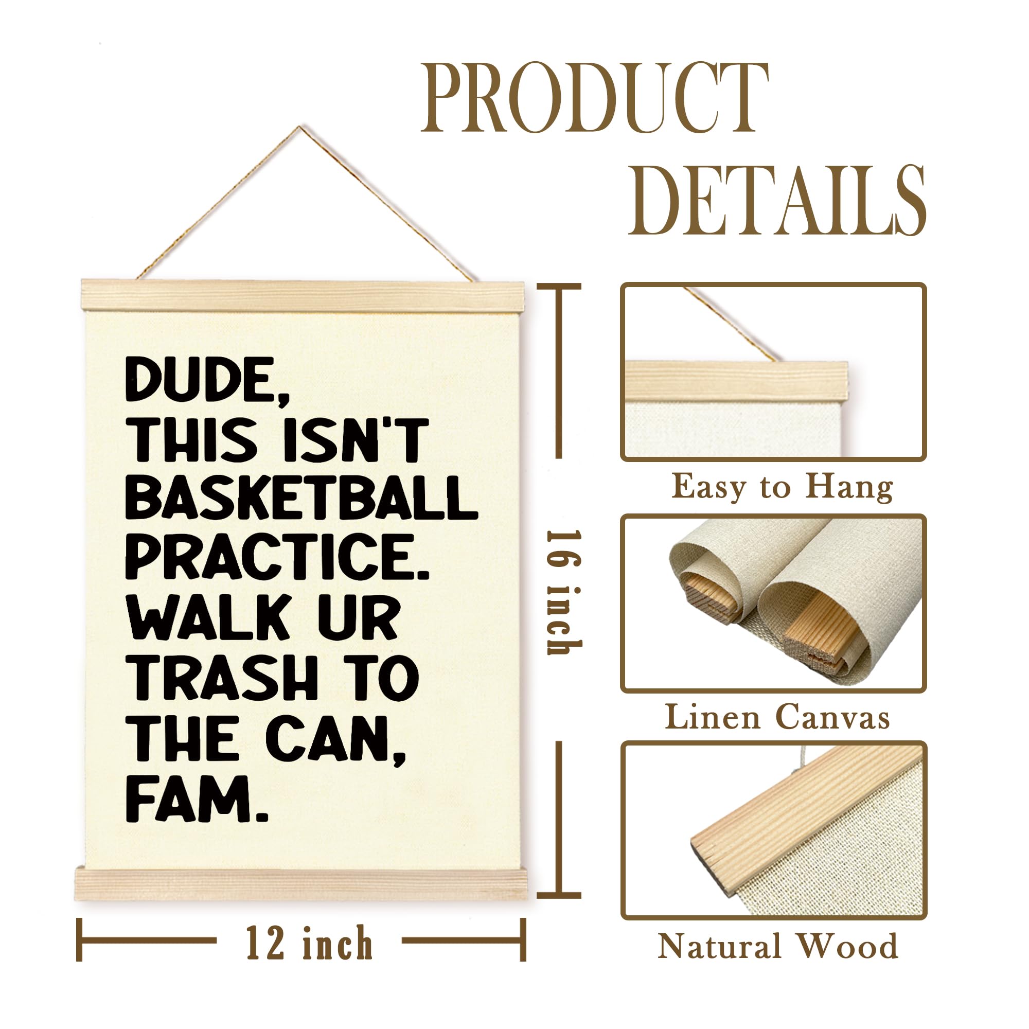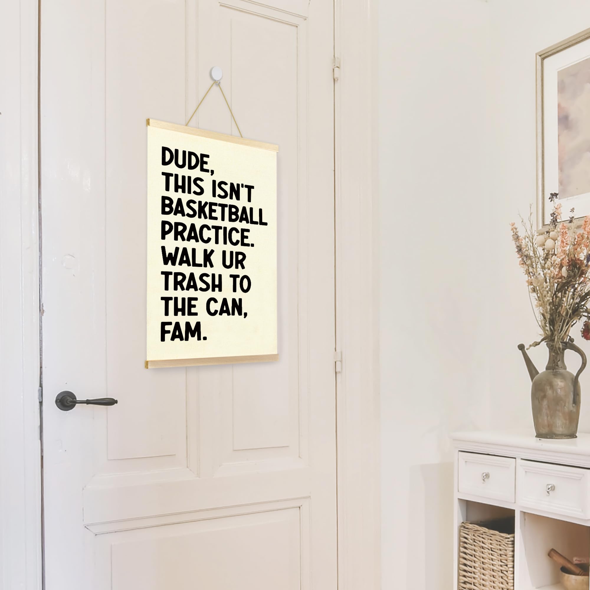Printed on natural linen fabric with solid wood bars on top and bottom. The wooden frame provides durability, and the linen material enhances the overall aesthetic appeal.