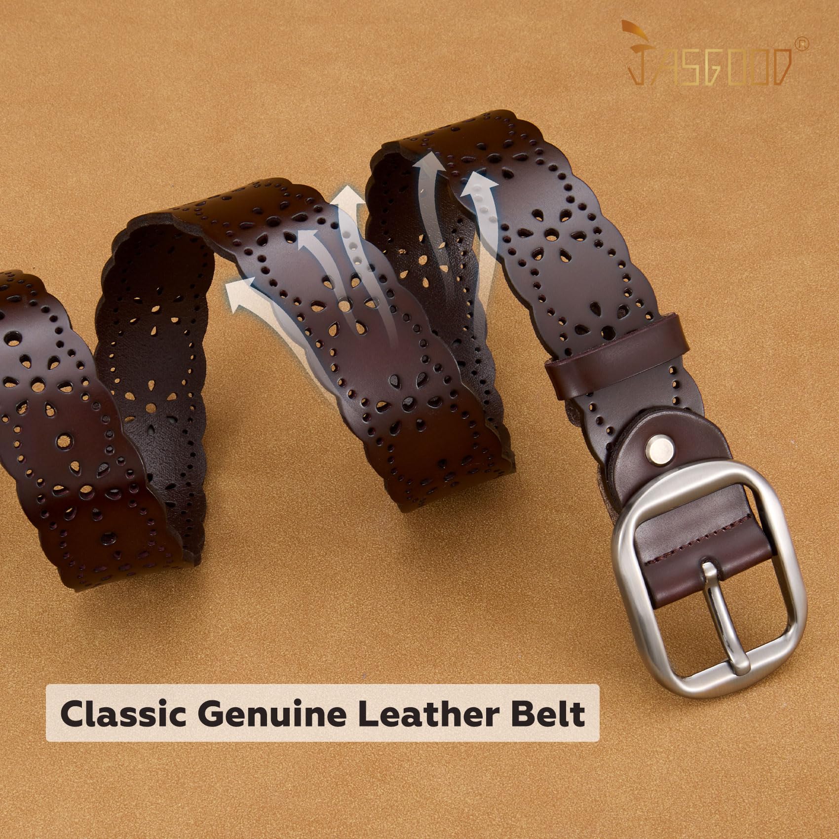 Women Wide Leather Belt made of high quality cowhide leather that touch so soft and durable. The metal buckle is polish surface without blemishes that always keep shiny. The flower cuts are very precise and have no residual flakes of leather.