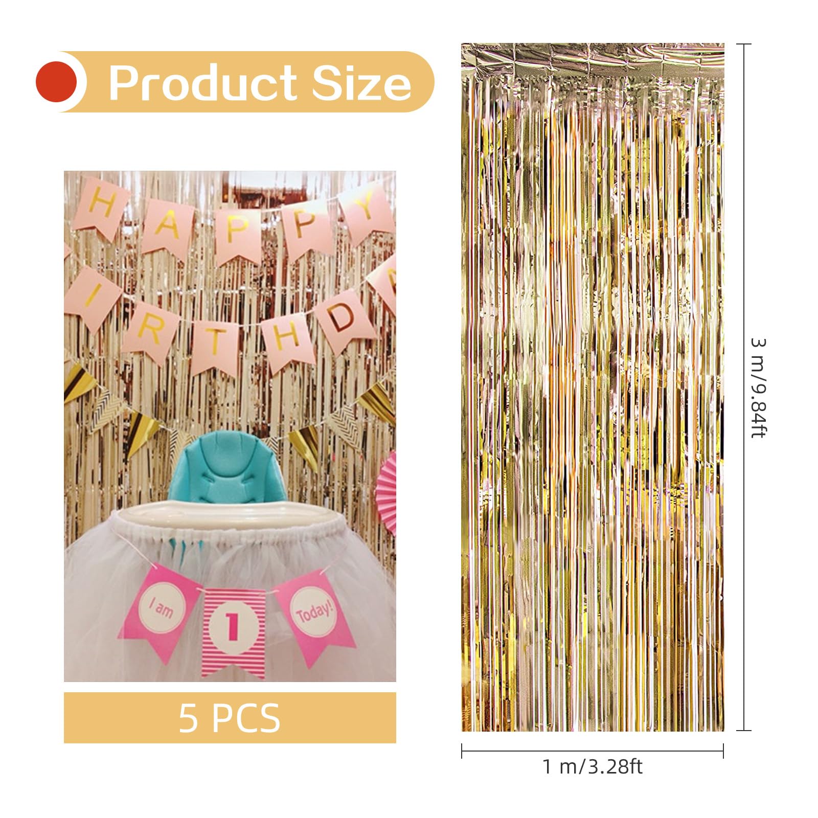 {Perfect Size}: Set of 5, each pack curtain size is 3.2ft x 9.8ft (1m x 3m). The foil curtain is 10 feet long, the perfect length size covers a wide area, and can cover the entire area that needs to be modified. Which is great to use for indoor or outdoor perfect decoration to create a perfect decorative backdrop.