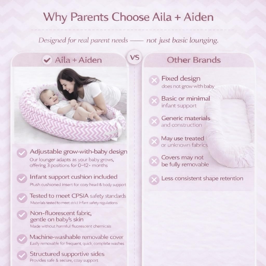 Gentle Comfort for Your Baby – Designed with ultra-soft 100% organic cotton and breathable materials, the Aila + Aiden baby lounger offers a cozy space for daytime use, tummy time, diaper changes, and bonding moments.