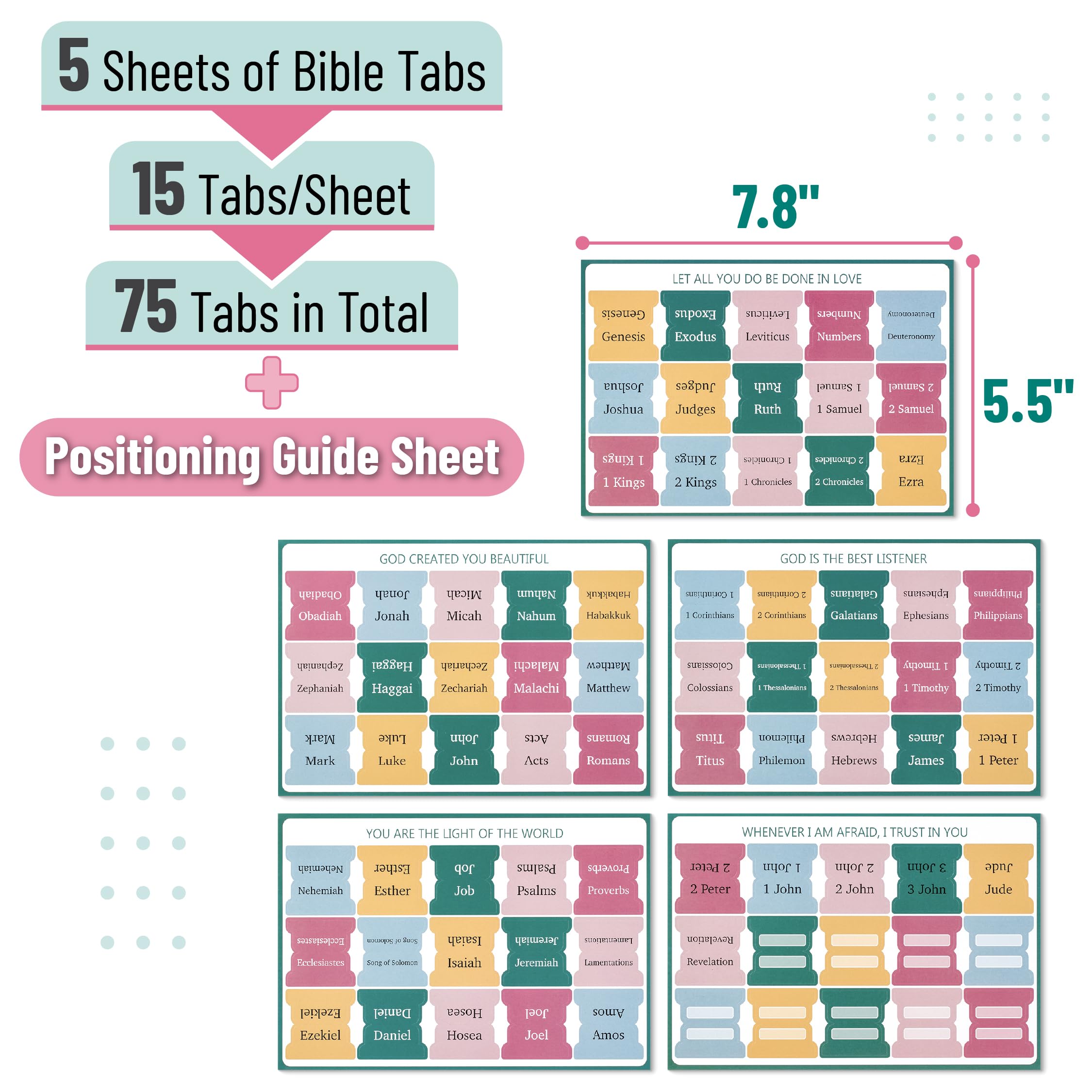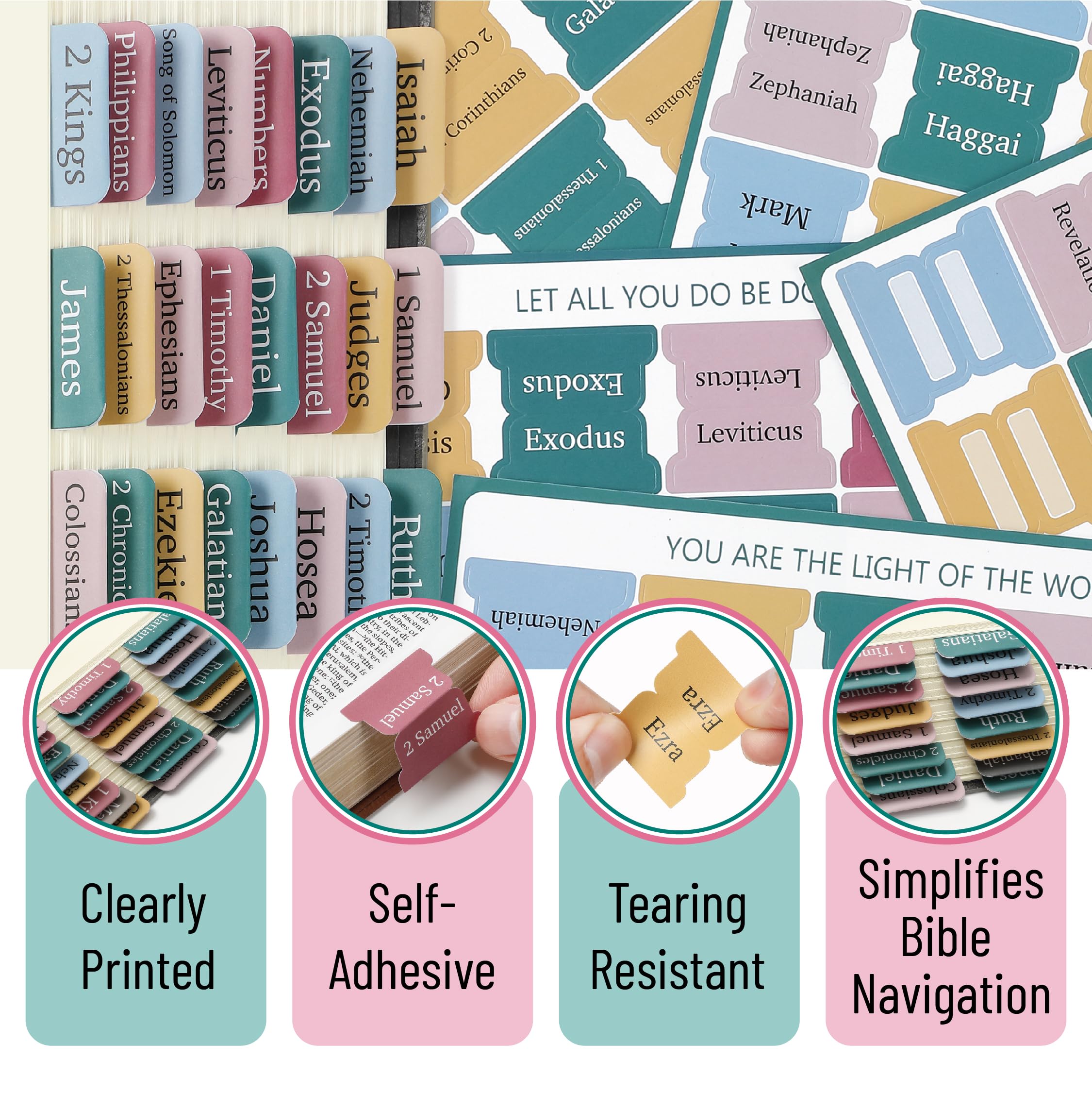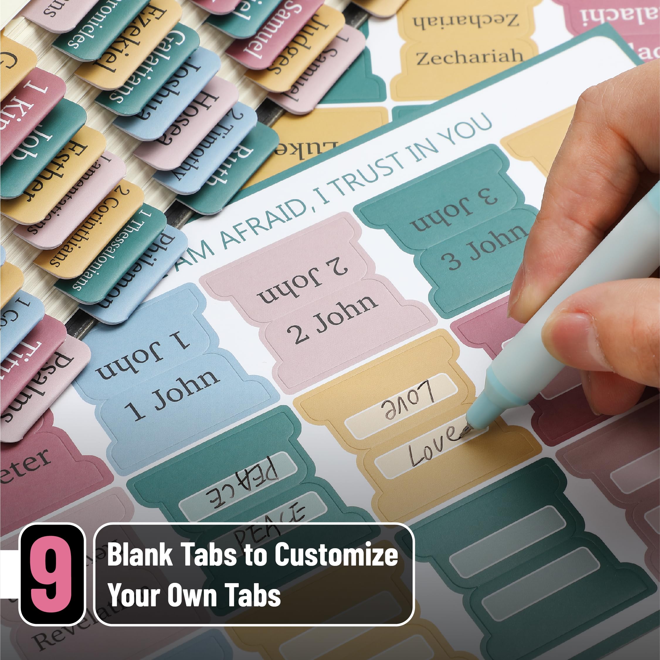 Make your Bible study more organized and inspiring with Mr. Pen set of 75 Bible tabs! Featuring an assortment of 39 Old Testament books, 27 New Testament books, and 9 blank tabs spread across five sheets.