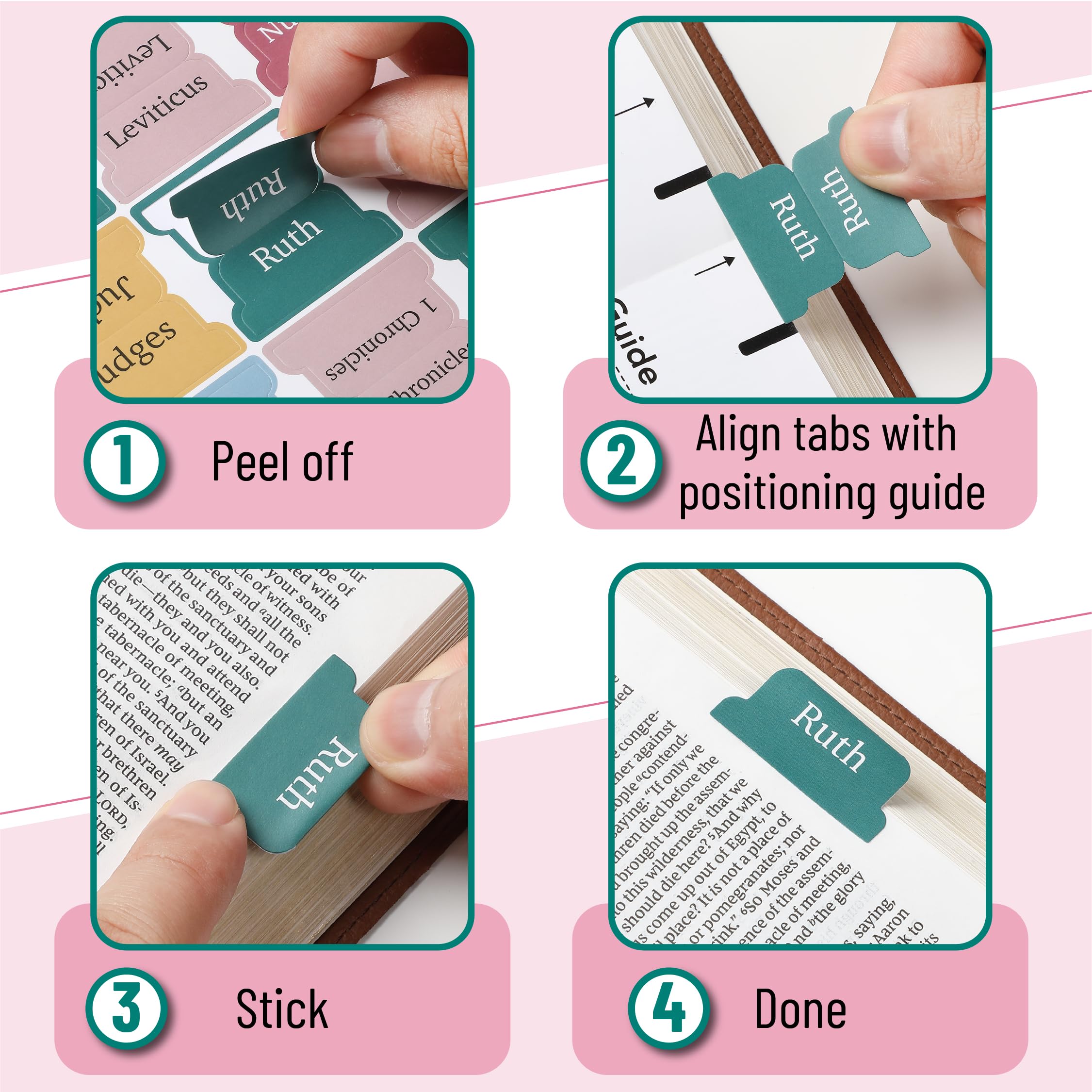 With the provided alignment guide, applying Bible indexing tabs has never been easier. These pre-cut tabs are designed to be quickly and easily folded for your convenience.