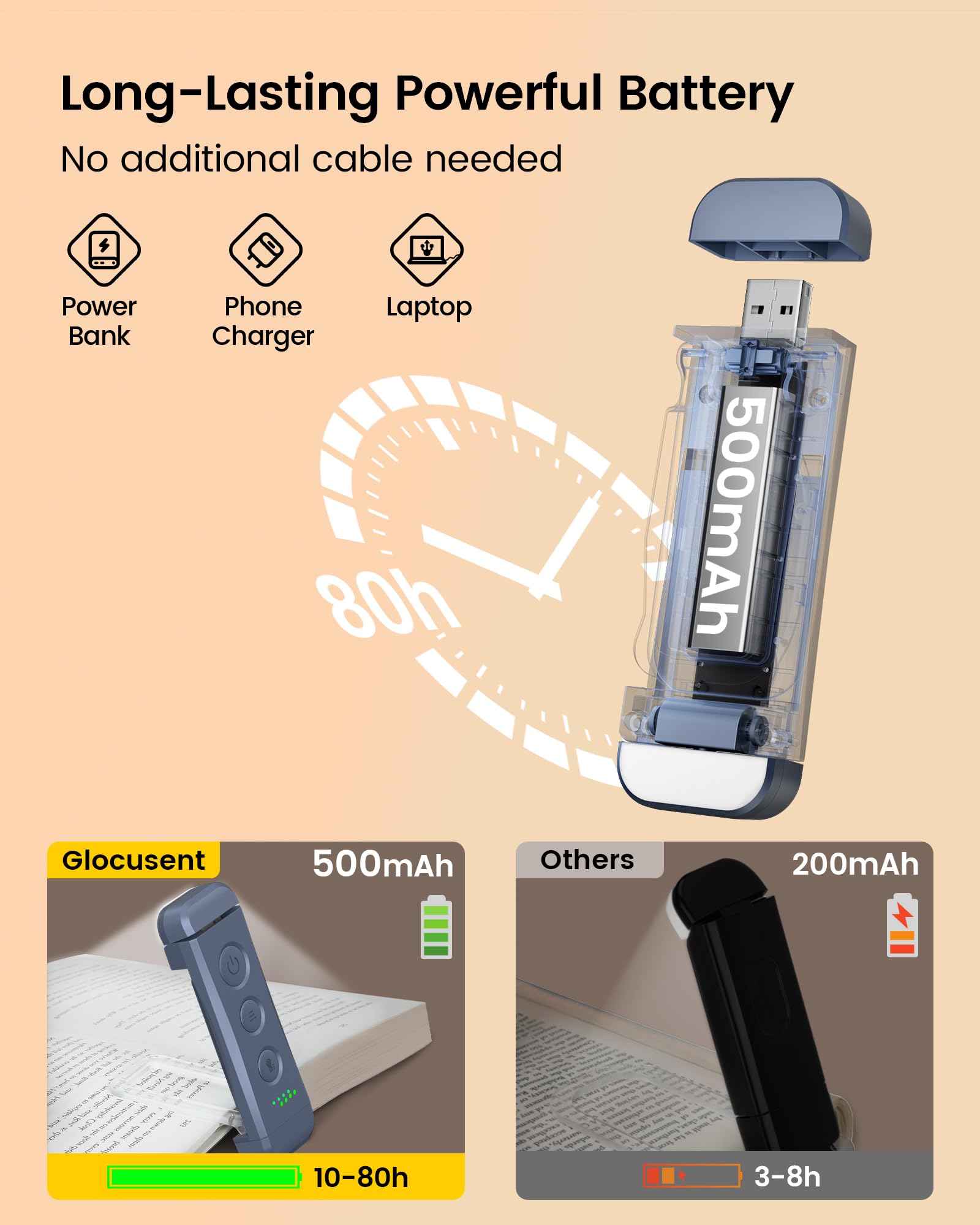 [ USB Rechargeable & Long Lasting] Standard USB rechargeable and compatible with any USB ports on your computer, adapter or USB outlet. This rechargeable reading lamp has a built-in 500mAh battery providing you with 10–80 reading hours (depending on your brightness setting). So you can enjoy your reading for 20 days to 3 months if you read 30 minutes per day, based on your light setting. Besides, there are 4 power indicators to show the power leftover.