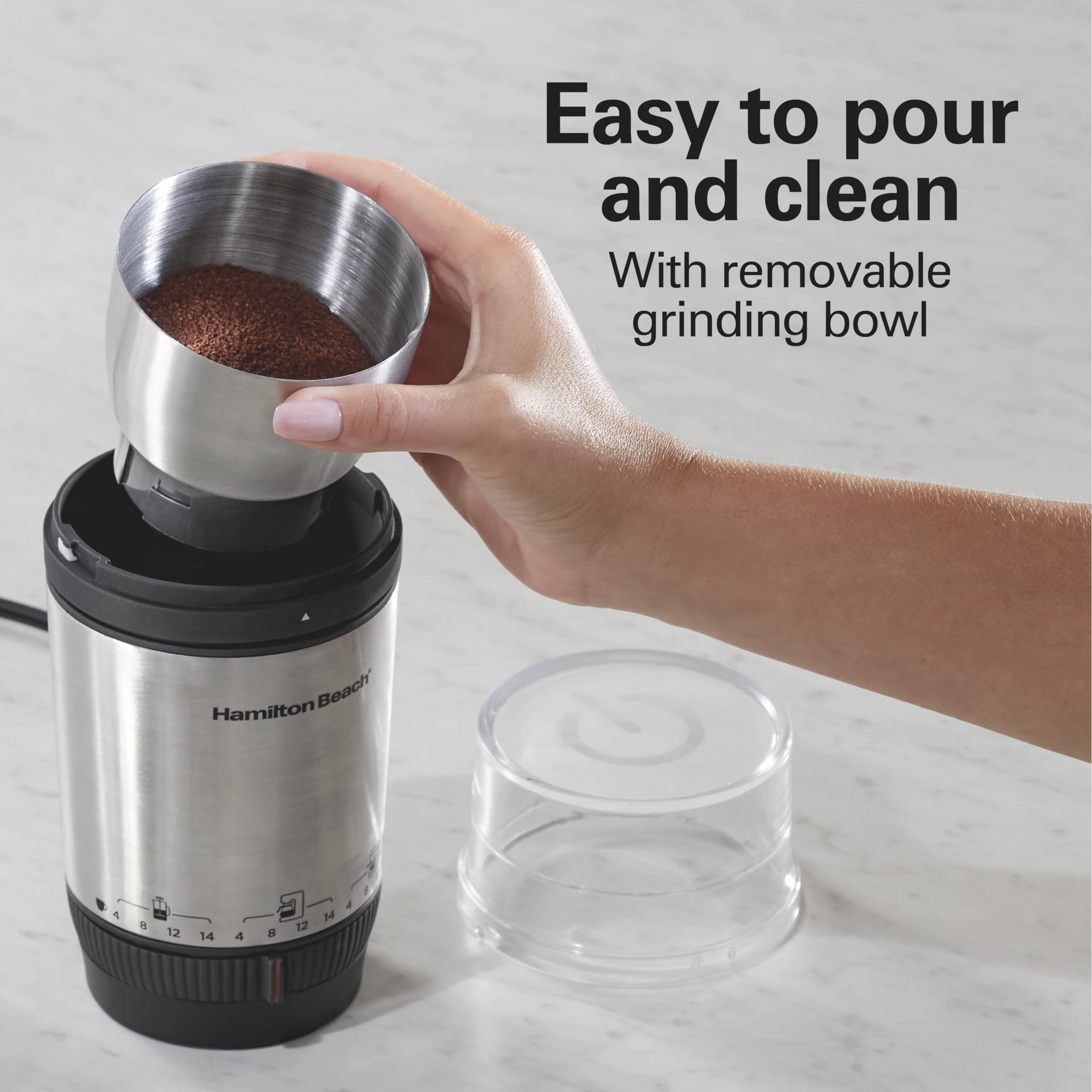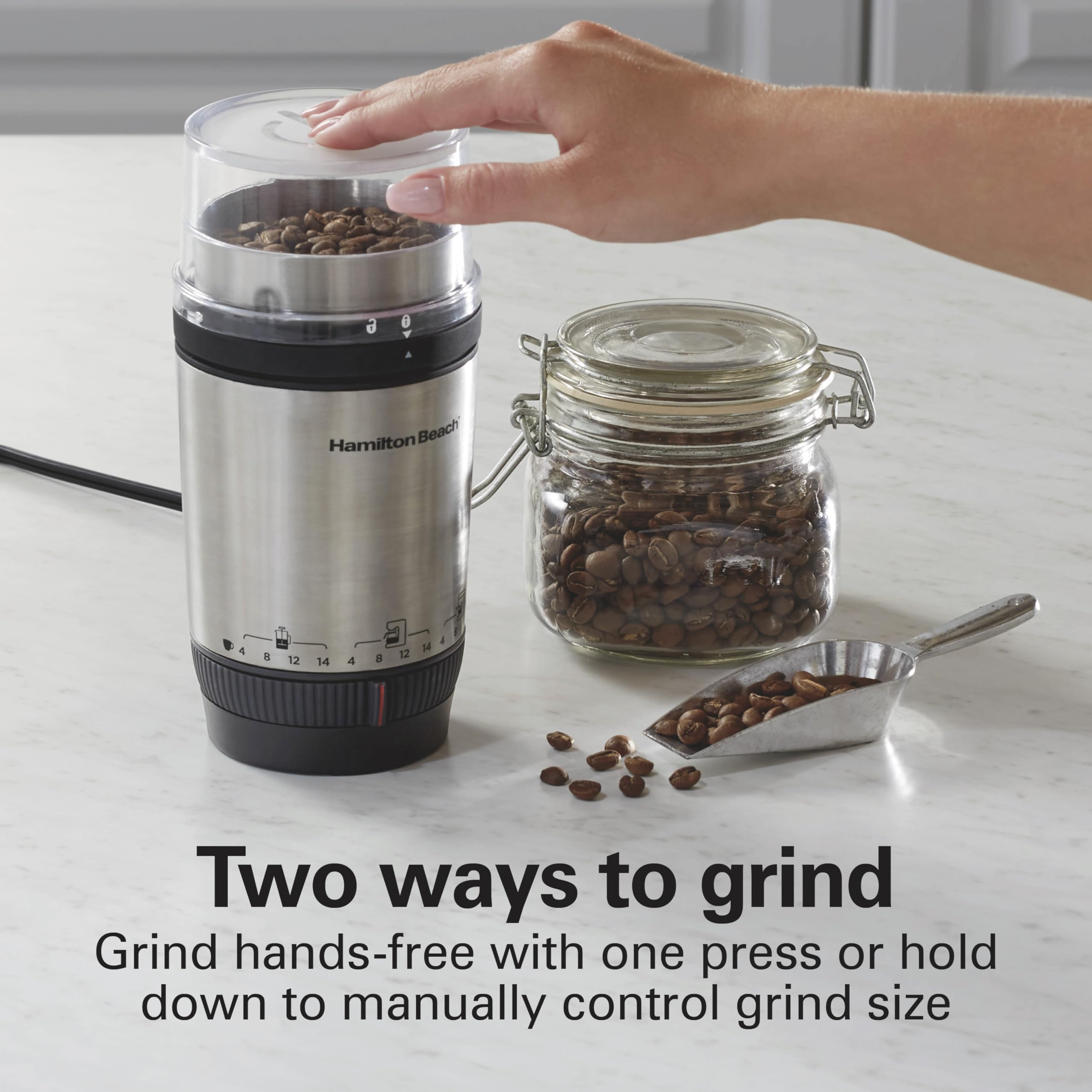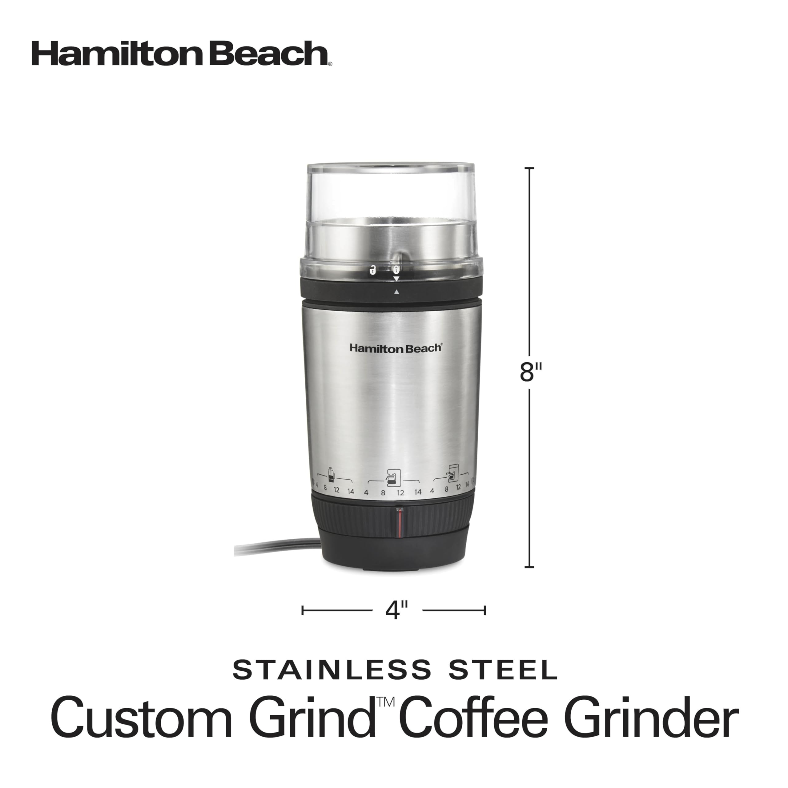 The Hamilton Beach® Stainless Steel Custom Grind™ Coffee Grinder grinds coffee hands-free or manually so you can enjoy freshly ground coffee your way every day. Easily control grind size and cups of brewed coffee with the adjustable selection ring.