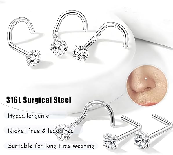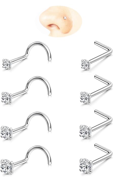 🆕Package Contents: An 8pcs set Includes 4 L-shaped and 4 corkscrew nose studs, offering glamor to your nose piercing