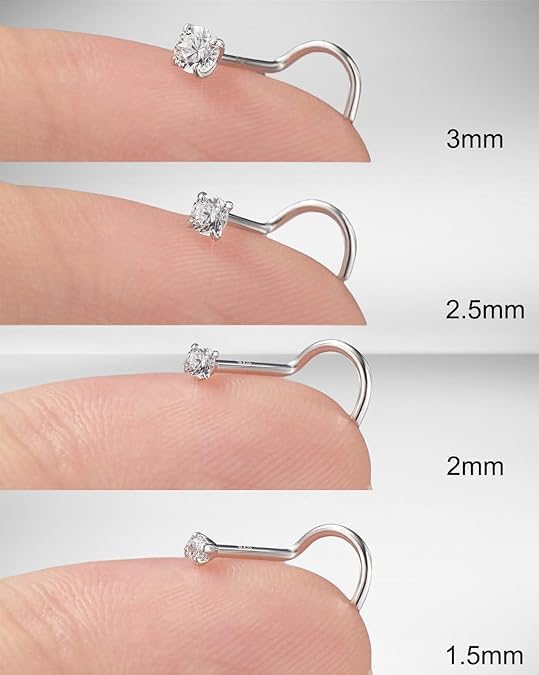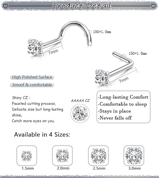 🆕Variety of Sizes Set: 8pcs nose studs in a set, All Gauge--18G(1.0mm); Pin Length: 7mm; Cubic Zirconia Size: 1.5/2/2.5/3mm. The multi-size set is designed to suit your everyday style. The 18Gauge nose piercings stud, adorned with a sparkling crystal, not only enhances your allure but also complements any outfit flawlessly