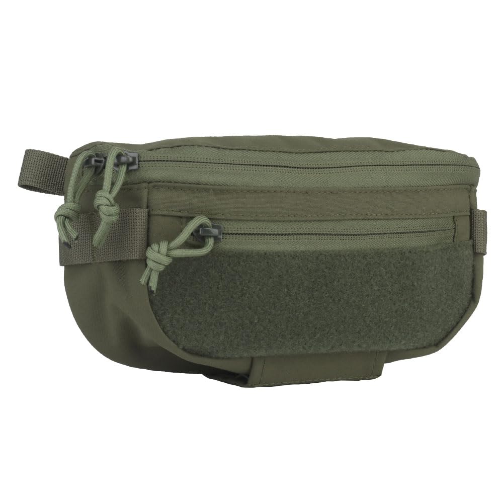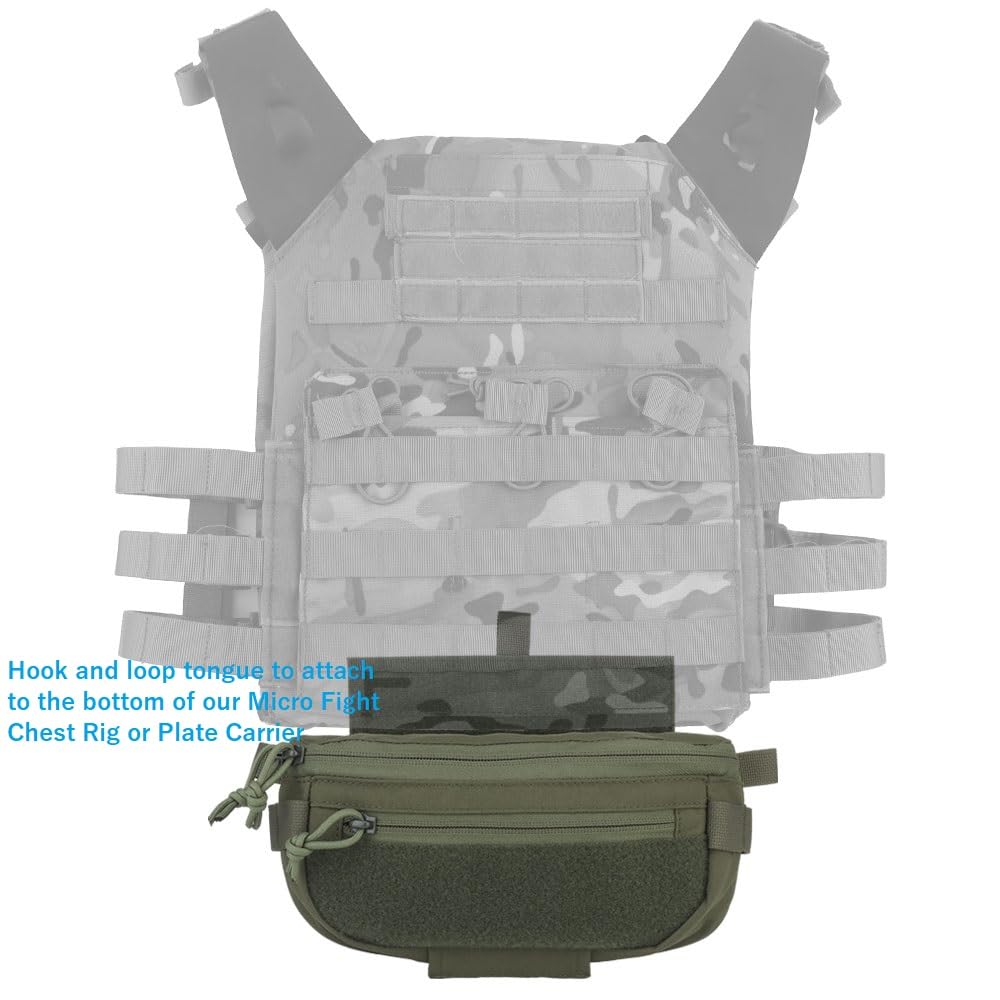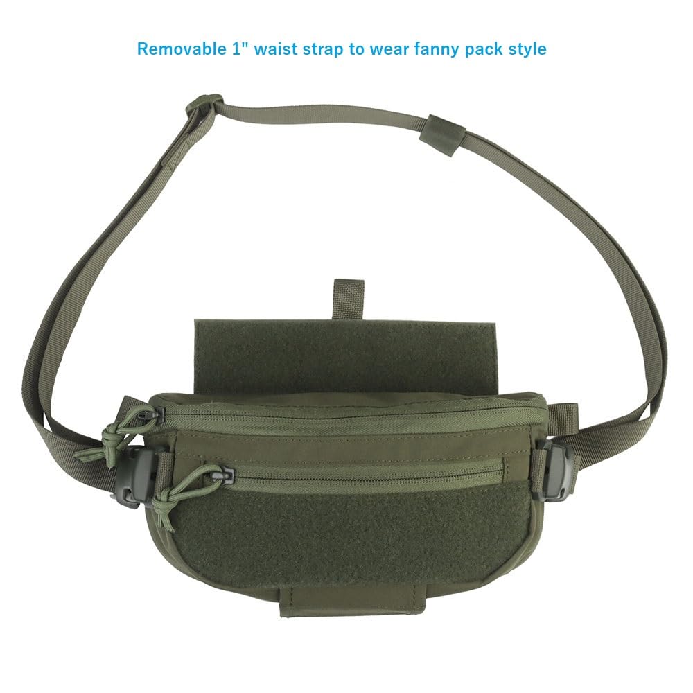 The Admin Pouch has a hook and loop tongue to attach to the bottom of Chest Rig or Tactical Vest,Additionally, the bag comes with a removable 1" waist strap to wear fanny pack style as well.When worn fanny pack style the hook and loop tongue will fold away, loop side toward the body, for comfort.