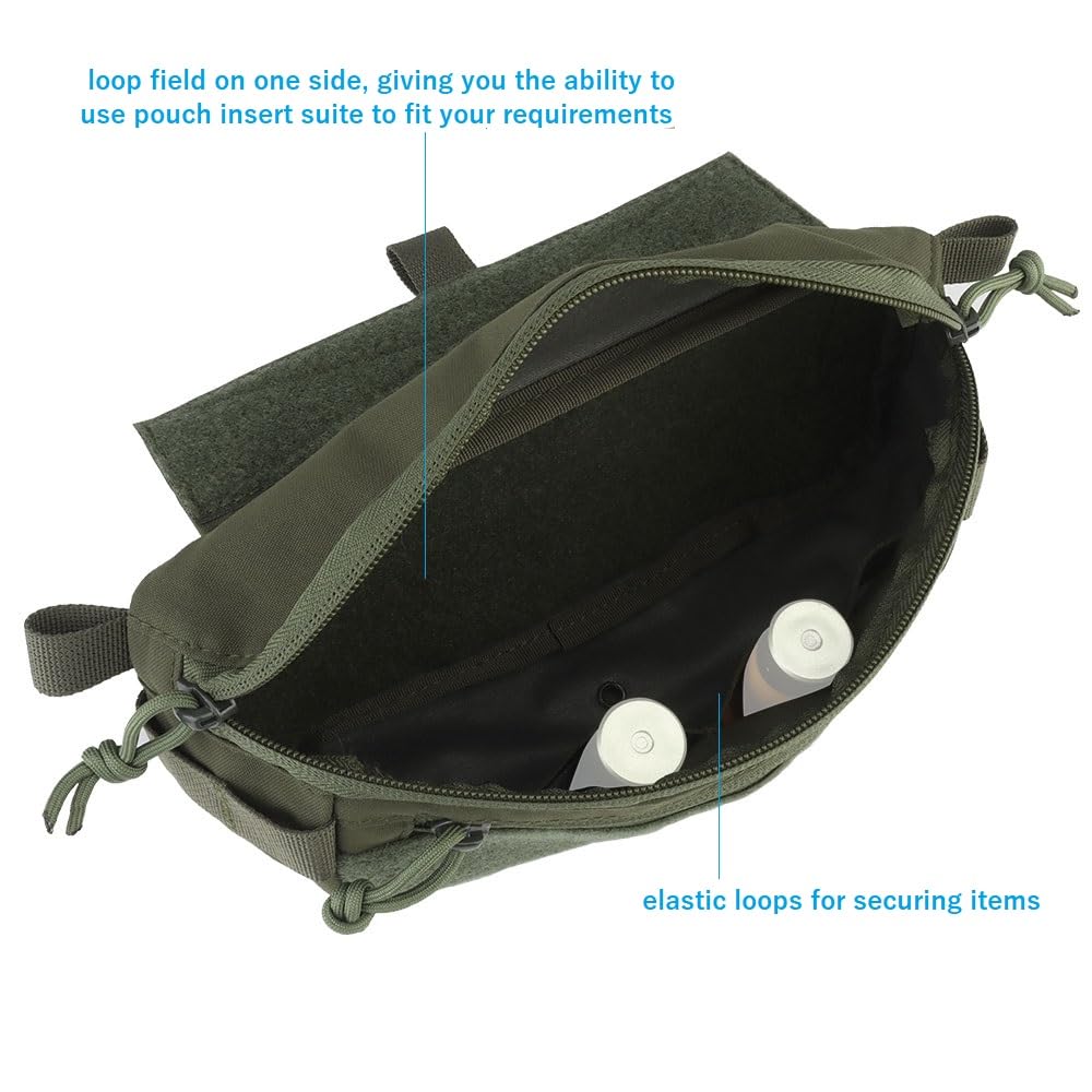 The main pouch inside features loop field on one sides, giving you the ability to use pouch insert suite to fit your requirements.the other side has 4 elastic loops to hold supplies such as bandages, tourniquets, folding knives, etc