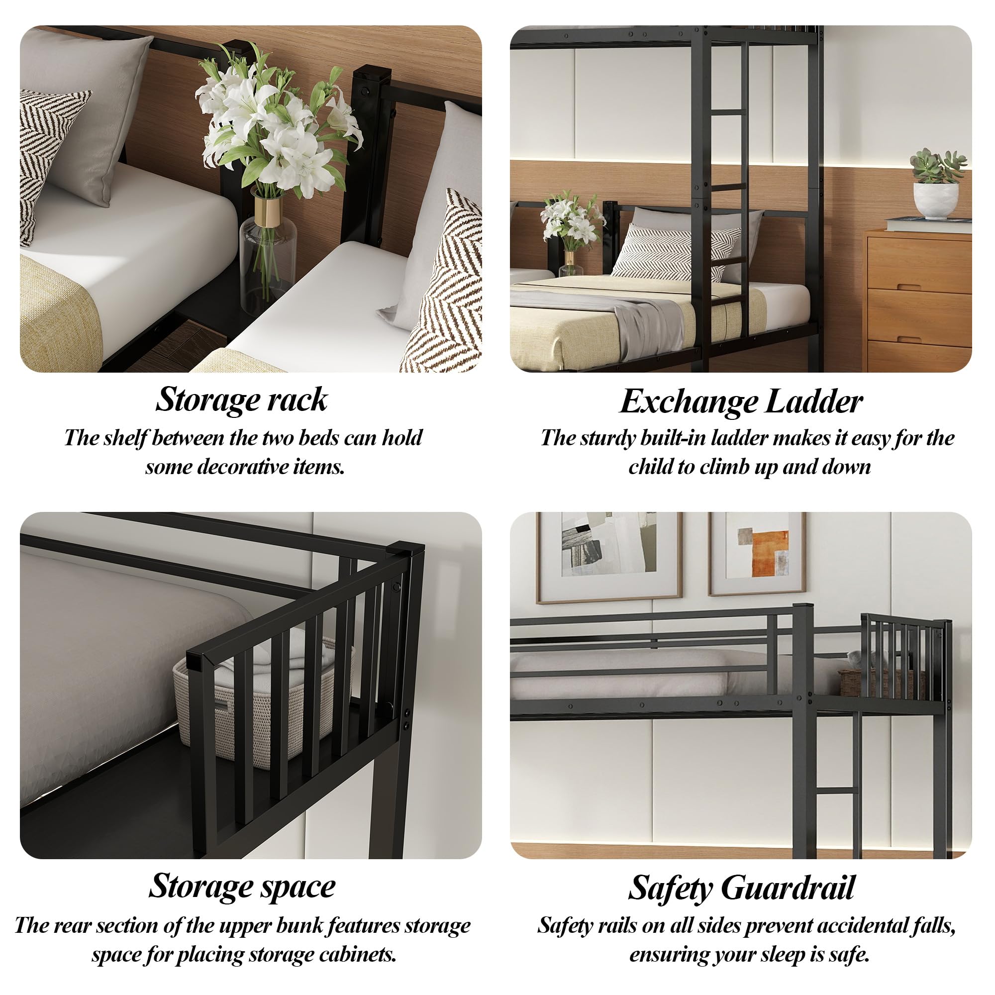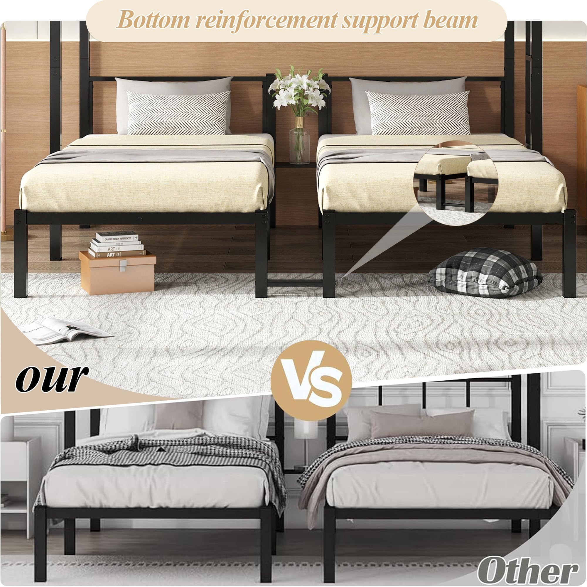 🏆🏆【Sturdy & Safe Construction】Built with premium metal and powder-coated finish, this twin over twin over twin bunk bed is rust-resistant and durable. The solid steel slats provide excellent support, eliminating the need for a box spring. Safety guardrails on the upper bunk ensure your kids sleep and play securely.