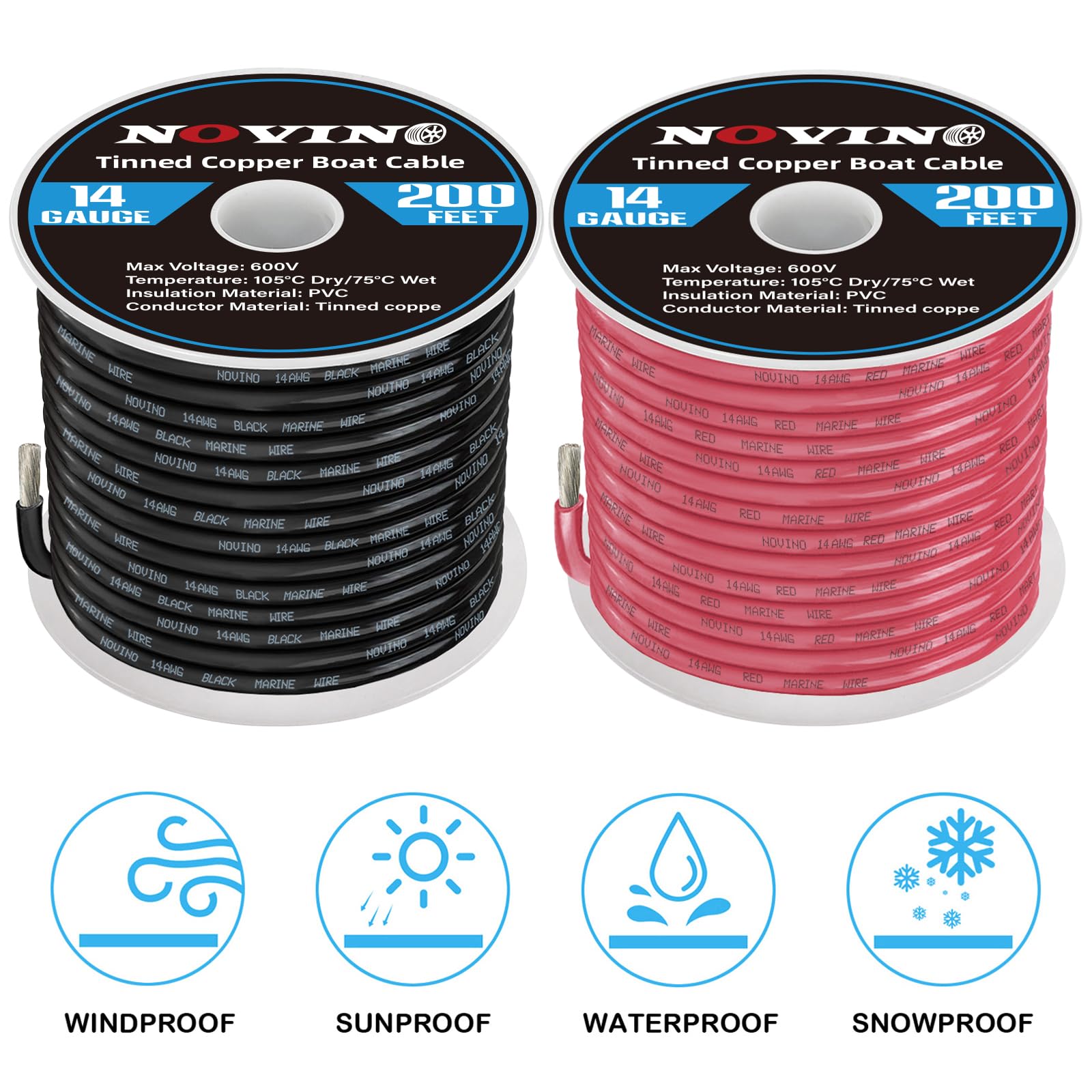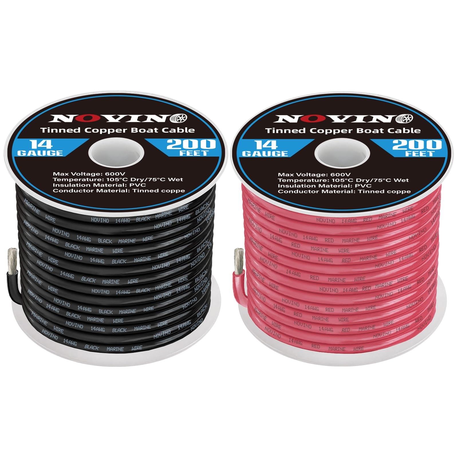 Boat Wire Cable Spec:Red&black conductor sheaths, tinned & stranded True 14 AWG copper wire,14 awg wire is insulation rated to 600v, 105 degrees C dry, and 75 degrees C wet