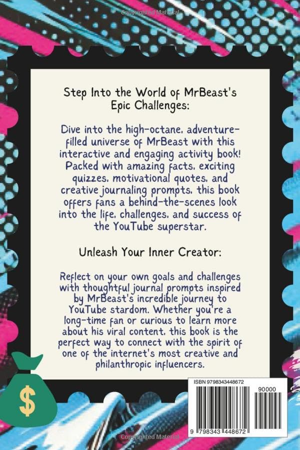 This is a must-have activity book for fans of the YouTube legend and internet sensation, MrBeast. Dive into 101 fascinating facts about MrBeast's life, viral challenges, and record-breaking achievements. From his early days on YouTube to becoming one of the platform's biggest creators, explore the incredible journey of one of the internet's most creative and philanthropic influencers. Interactive Features Include: Quizzes: Test your knowledge of MrBeast’s viral videos, epic stunts, and incredible records. Design Your Dream Challenge: Imagine you're planning your very own MrBeast-style challenge! Journaling Prompts: Reflect on your goals, set challenges, and think about how you can give back like MrBeast! Word Searches: Find hidden words related to MrBeast's most iconic moments and massive giveaways. Coloring Pages: Unleash your creativity with pages inspired by MrBeast's craziest stunts and biggest challenges. Perfect for fans new and old, this activity book offers a fun, engaging experience that celebrates MrBeast’s remarkable journey!