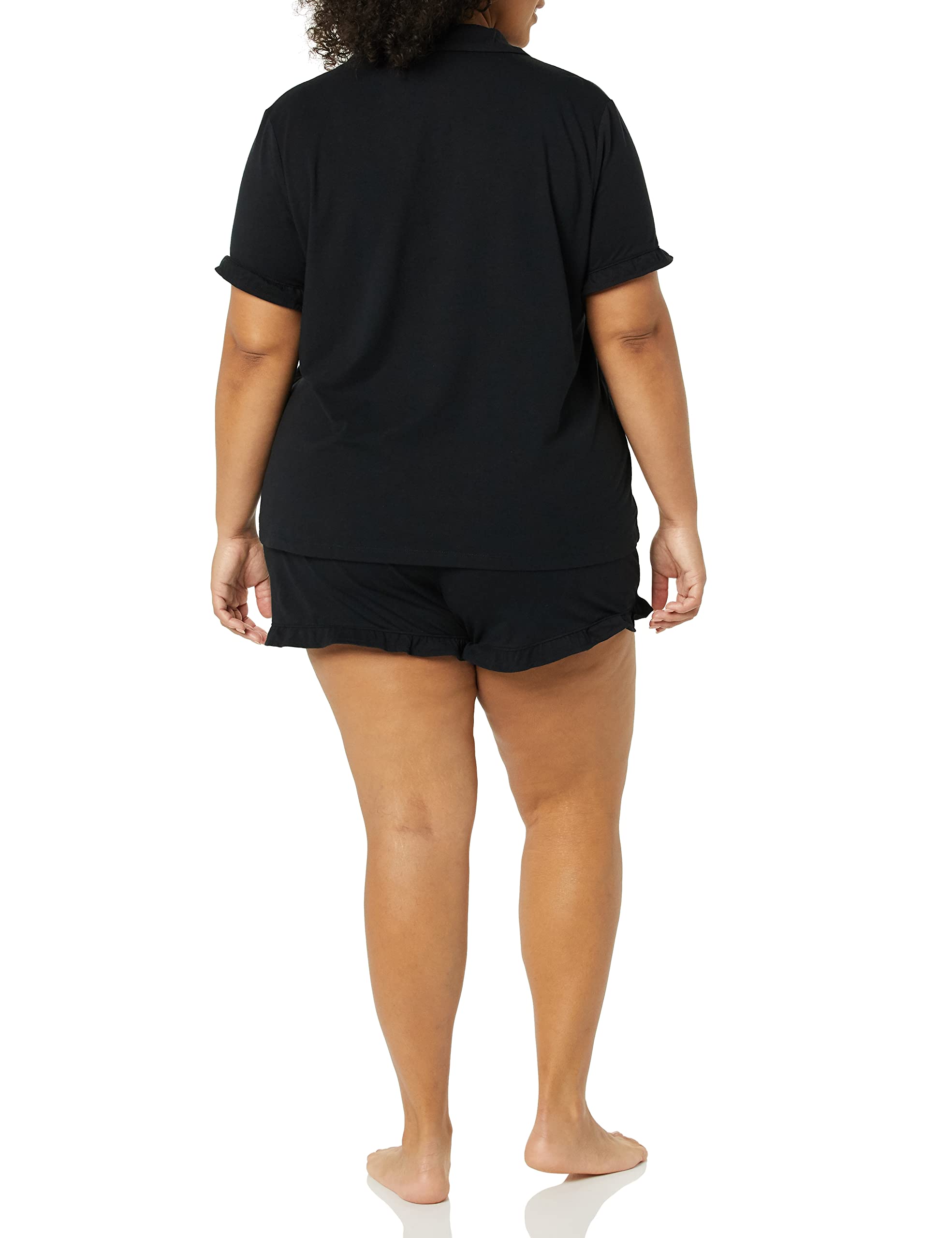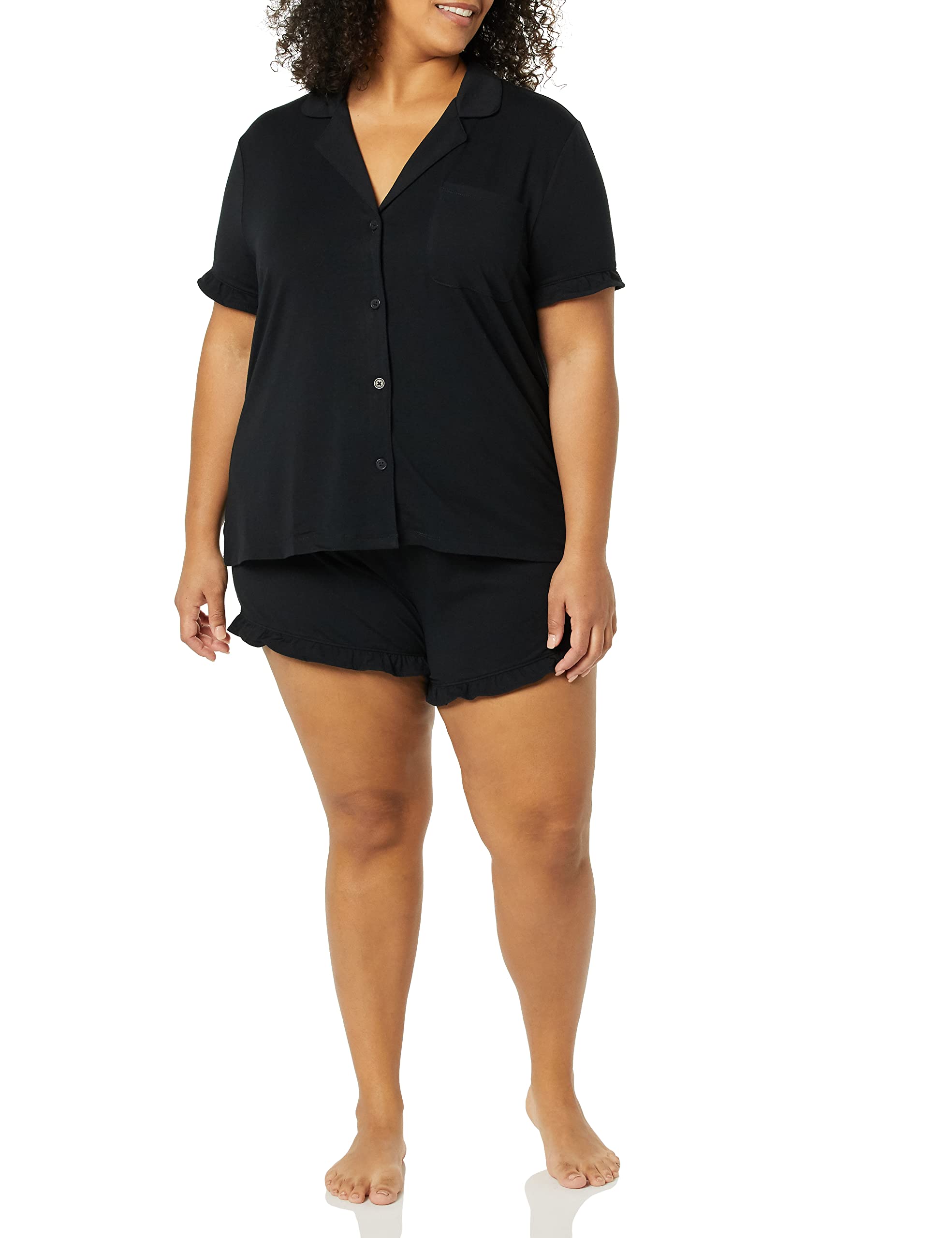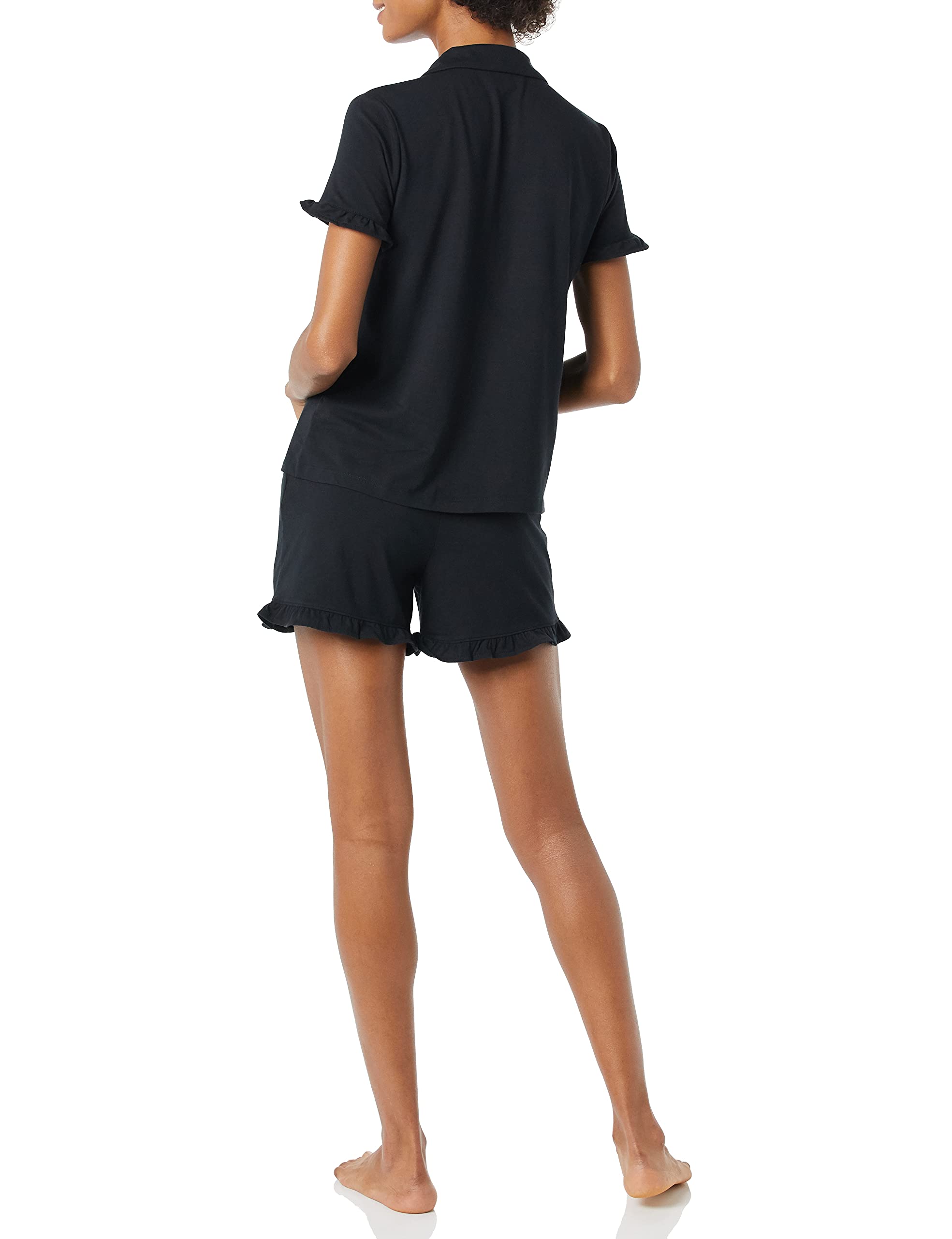 DETAILS: The top features a notch collar, single patch pocket, and ruffle detail at sleeve opening. The shorts feature an elasticated waistband and feminine ruffle detail at leg opening.