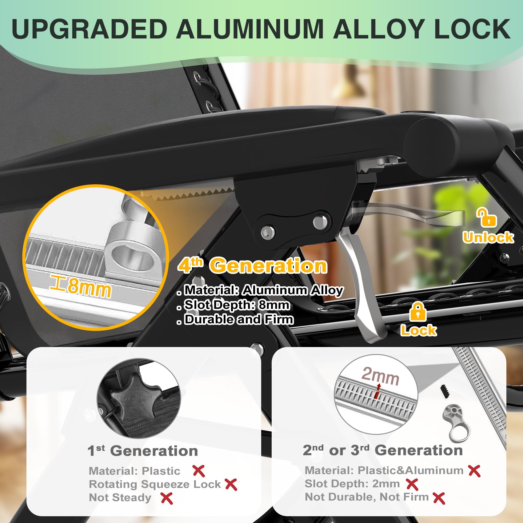【Effortless Adjustment & Secure Locking】The zero gravity recliner features a 4th-generation upgraded aluminum alloy locking system, allowing smooth adjustment from 90º to 170º with minimal effort. Its 8mm deep locking groove provides a stronger, more reliable hold—far superior to previous 2mm plastic or aluminum buckles—ensuring enhanced safety and preventing accidental slipping. Enjoy seamless reclining and a true weightless, stress-free relaxation experience