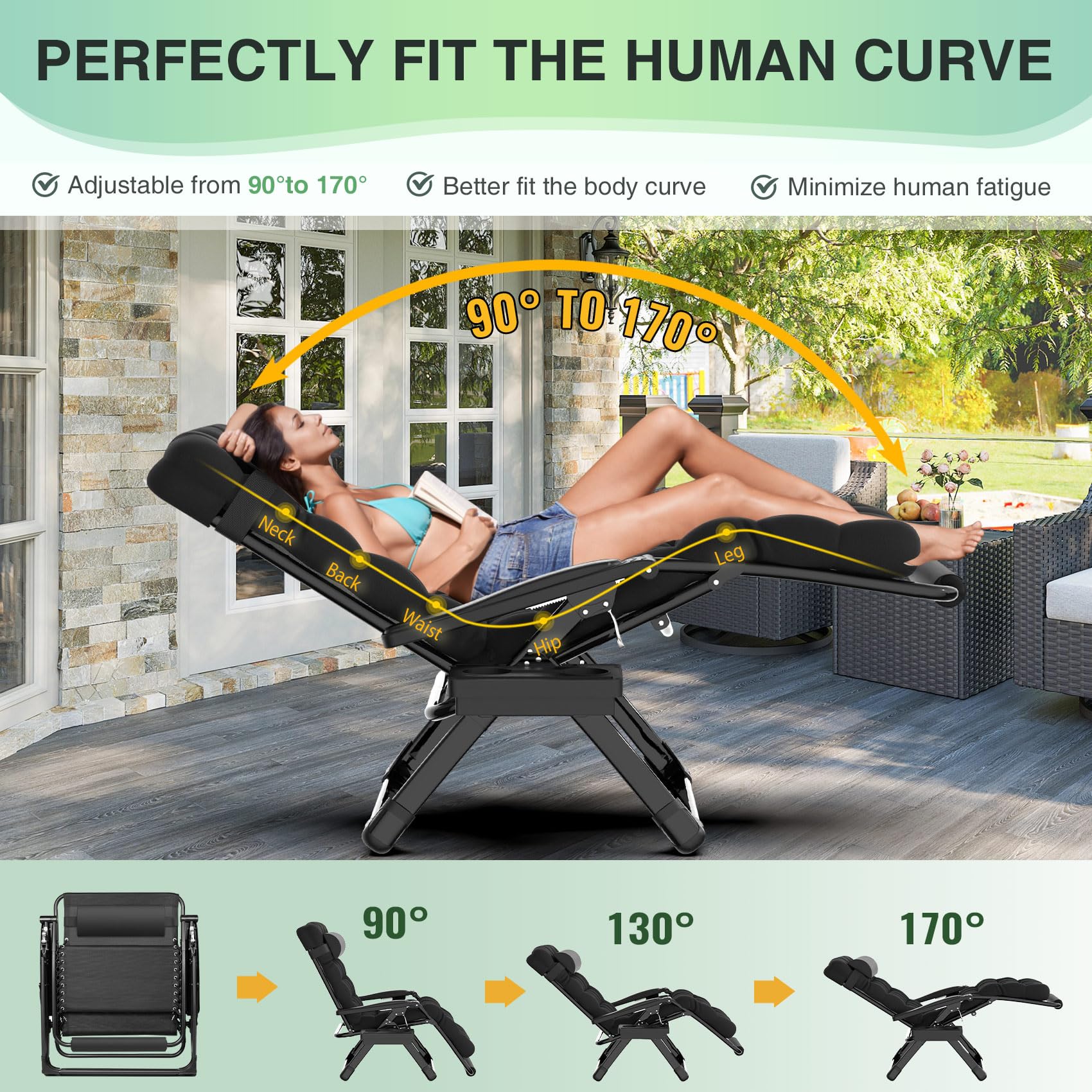 【Portable and Versatile】This foldable zero gravity chairs arrive fully assembled—simply unfold it and it's ready to use within seconds. Its lightweight, foldable design makes it easy to carry and store, perfect for use in your yard, lawn, patio, deck, garden, balcony, poolside, or at the beach