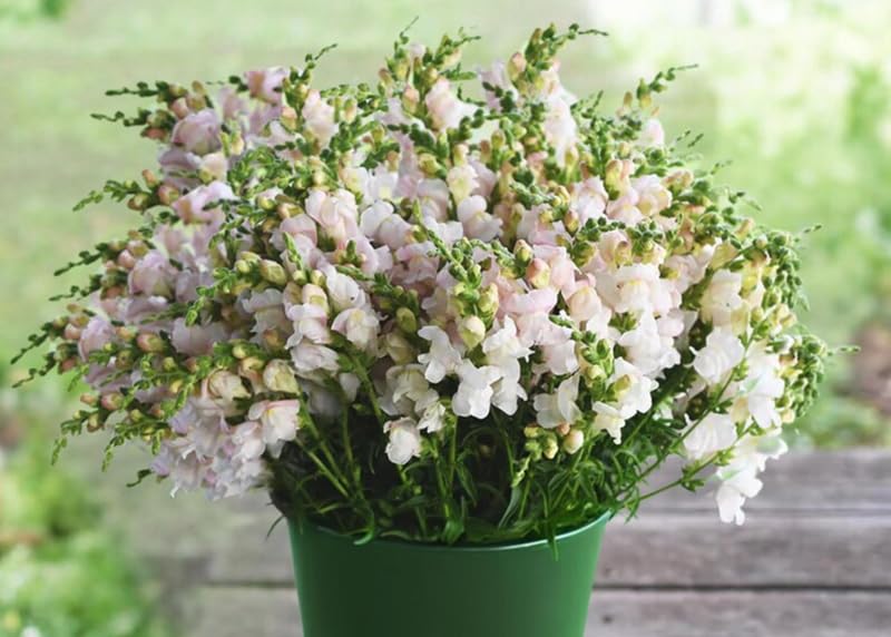 Instructions: 1. Prepare Soil: Use well-draining, fertile soil rich in organic matter. Snapdragons prefer slightly acidic to neutral soil (pH 6.2-7.0). Loosen the soil to a depth of 8-10 inches. 2. Start Indoors: Start snapdragon seeds indoors 8-10 weeks before the last frost date. Use seed trays or small pots filled with seed-starting mix. 3. Plant Seeds: Sprinkle the tiny snapdragon seeds on the surface of the soil. Lightly press them into the soil without covering, as snapdragon seeds need light to germinate. Mist the soil gently to moisten it. 4. Provide Light: Place seed trays in a bright location or under grow lights. Snapdragons need plenty of light to germinate and grow strong. 5. Provide Cool Temperatures: Snapdragons prefer cooler temperatures for germination, around 60-70°F (16-21°C). 6. Maintain Moisture: Keep the soil consistently moist but not waterlogged. Cover the seed trays with a clear plastic cover to retain moisture until seeds germinate. 7. Transplant: Once seedlings have at least two sets of true leaves and the danger of frost has passed, transplant them into the garden or larger pots. Space plants 6-12 inches apart, depending on the variety. 8. Provide Sunlight: Snapdragons thrive in full sun to partial shade. Choose a location that receives at least 6 hours of direct sunlight per day. 9. Watering: Water snapdragons regularly, keeping the soil evenly moist. Avoid overhead watering to prevent fungal diseases. 10. Fertilize: Apply a balanced, water-soluble fertilizer every 4-6 weeks during the growing season. Follow package instructions for dosage. 11. Pinch Back: Pinch back the growing tips of young plants to encourage bushier growth and more blooms. 12. Deadhead: Remove spent flowers (deadheading) to encourage continuous blooming throughout the season. 13. Pest and Disease Control: Monitor your snapdragons for common pests like aphids and diseases such as rust and powdery mildew. Use organic pest control methods if necessary.