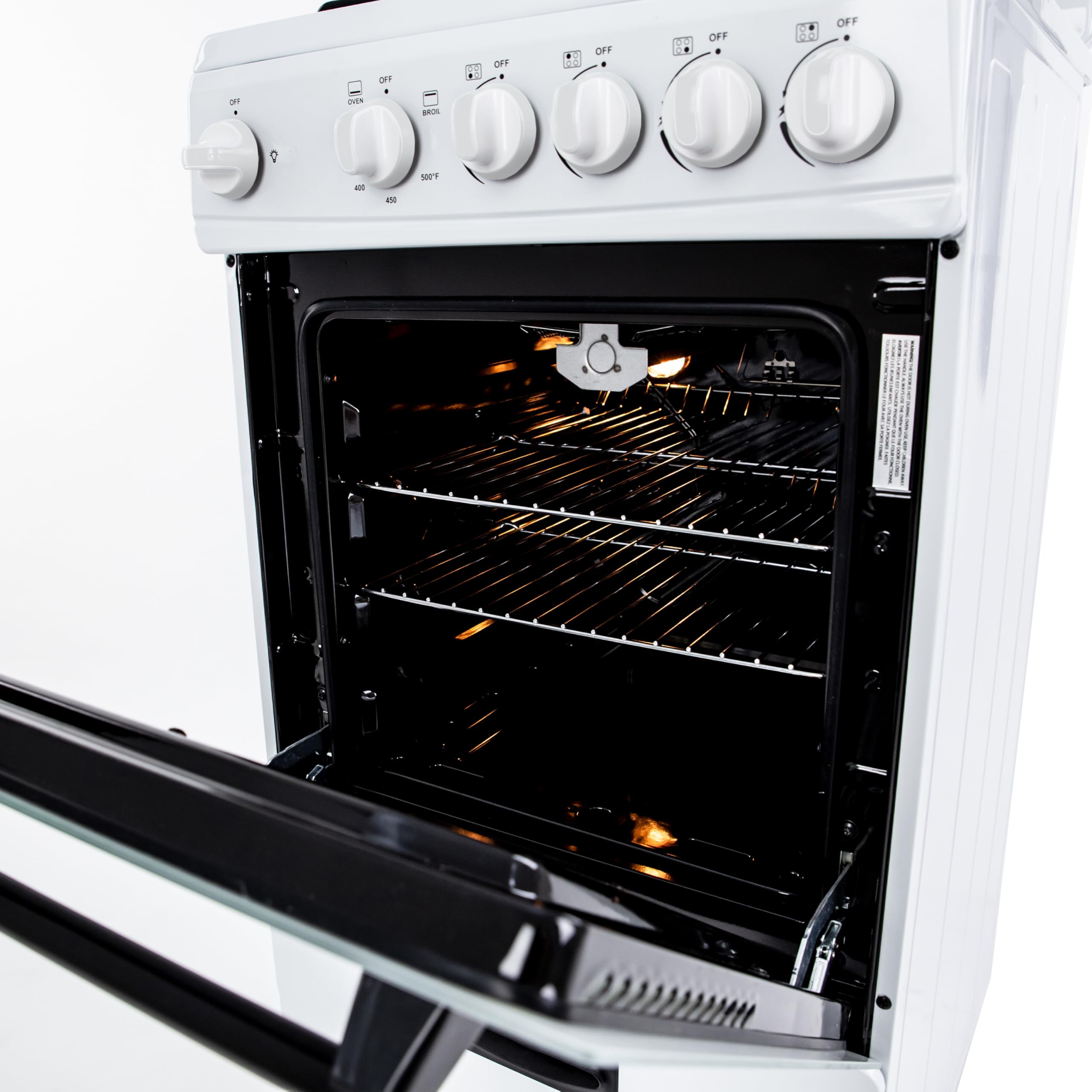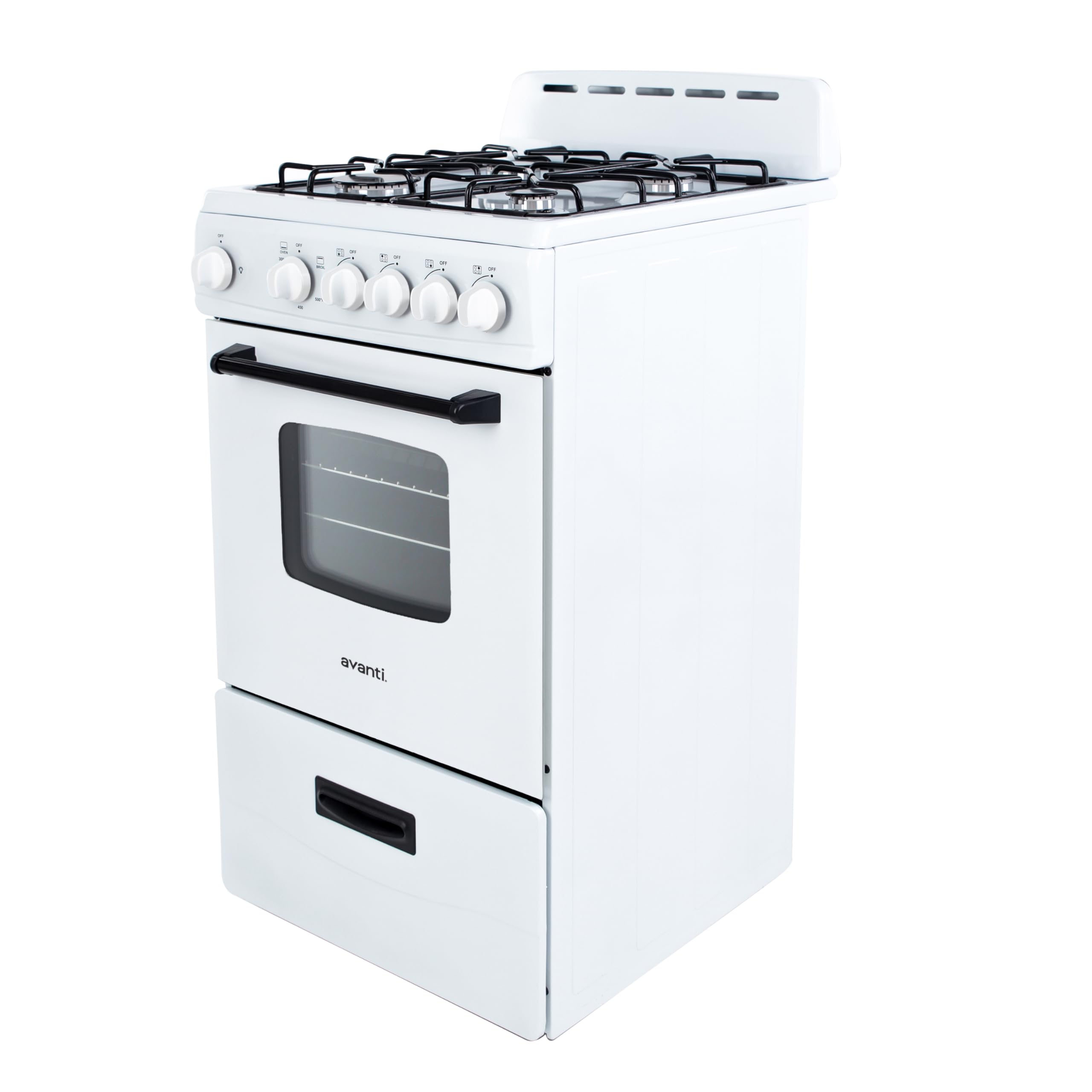 Product Description The Avanti 20-Inch Gas Range Oven in white is a space-saving yet high-performance appliance, ideal for compact kitchens, studio apartments, RVs, and vacation homes. This 2.1 cu. ft. freestanding gas range features 4 sealed burners (1 rapid, 2 semi-rapid, and 1 simmer) with automatic electronic ignition for precise and efficient cooking. The oven is designed with a seamless framed glass door, two oven racks, a broiler with a broiling pan, and a bottom storage drawer for additional convenience. It also includes full-range temperature control, an oven light with an ON/OFF switch, and a 60-minute timer to make cooking easier. Built with ADA compliance, a backsplash with integrated oven vents, and an LP conversion kit, this gas range is a reliable choice for small-space living. Backed by Avanti’s 1-Year Manufacturer Limited Warranty, it ensures long-lasting performance. From the Manufacturer 20" Gas Range with Automatic Electronic Ignition and See-Thru Glass Oven Door