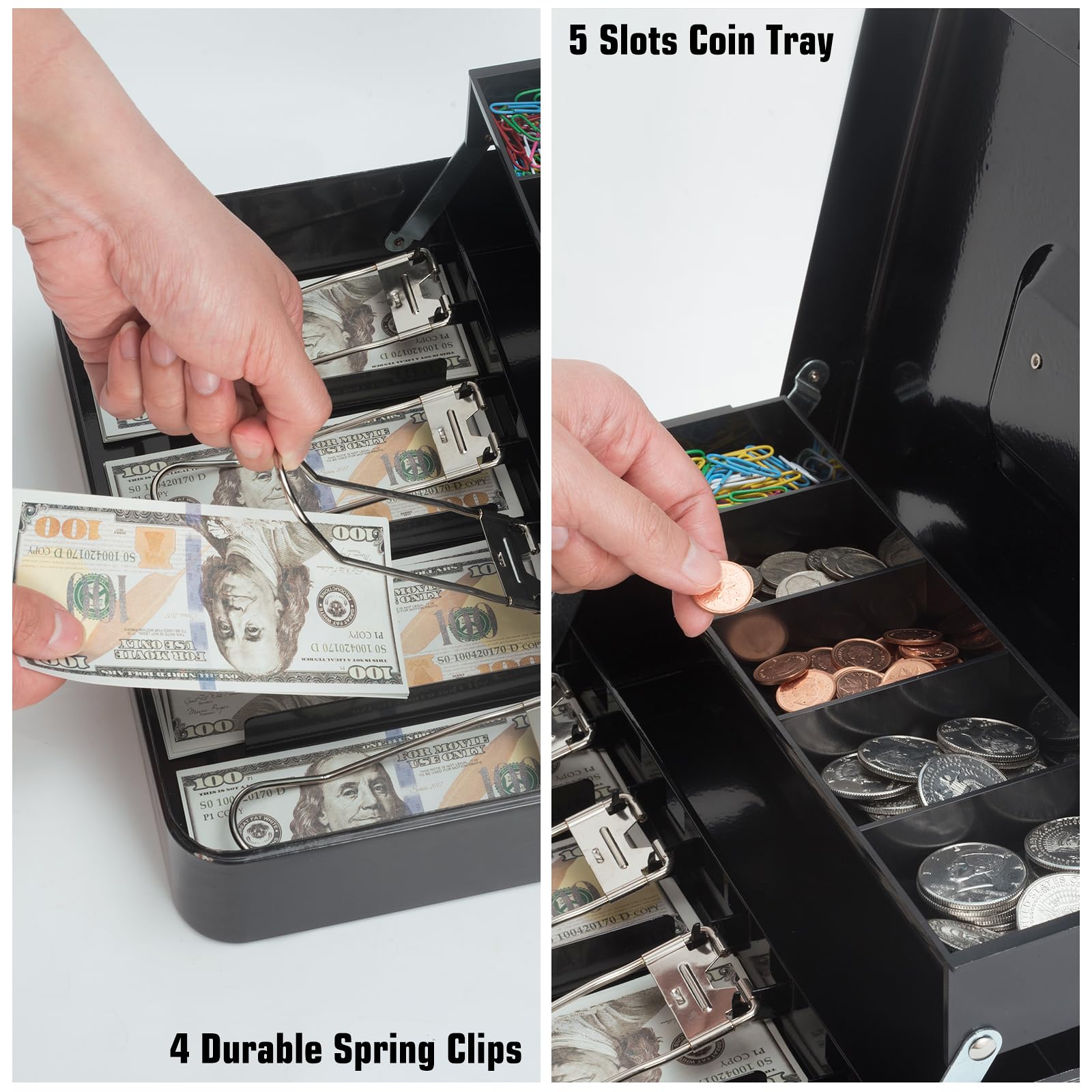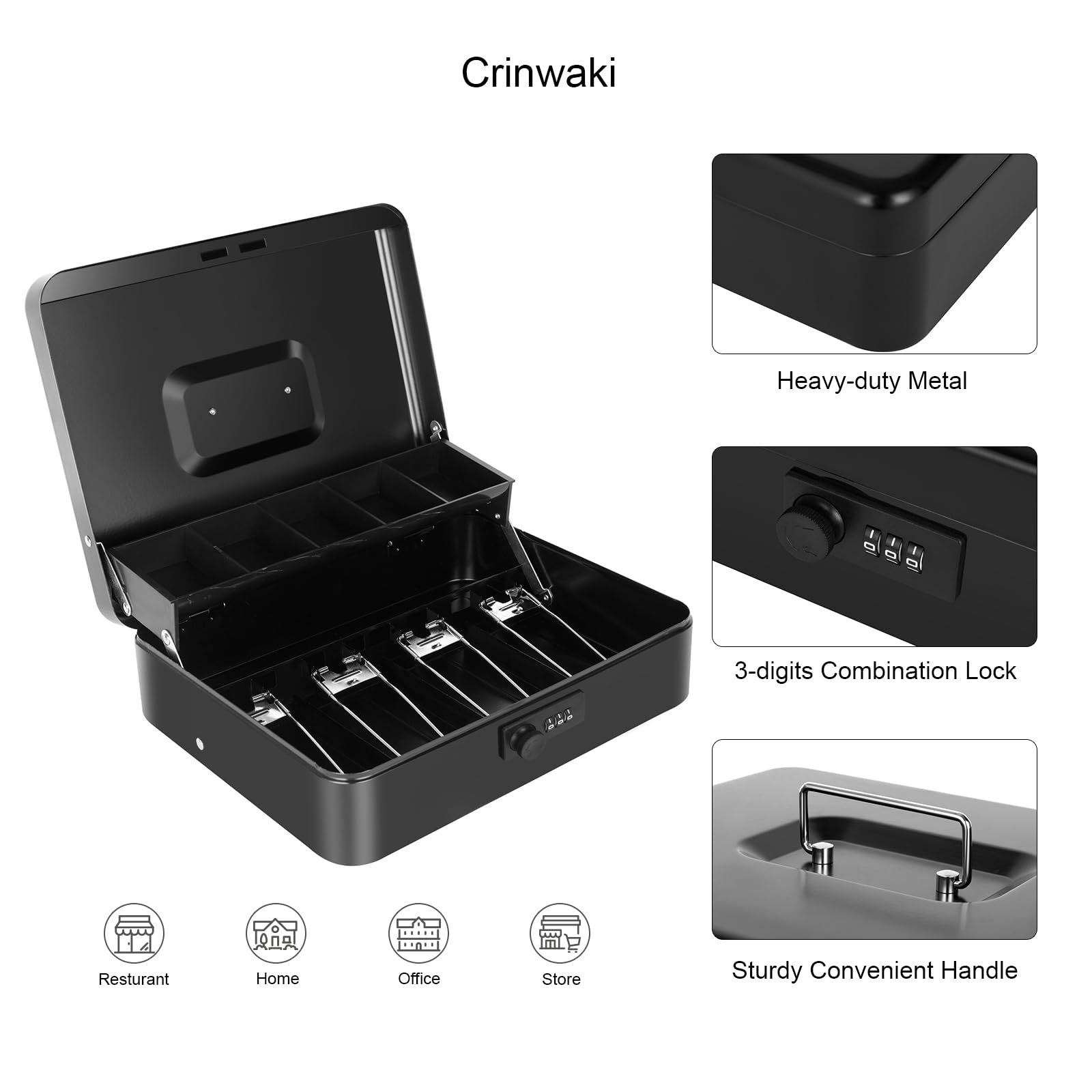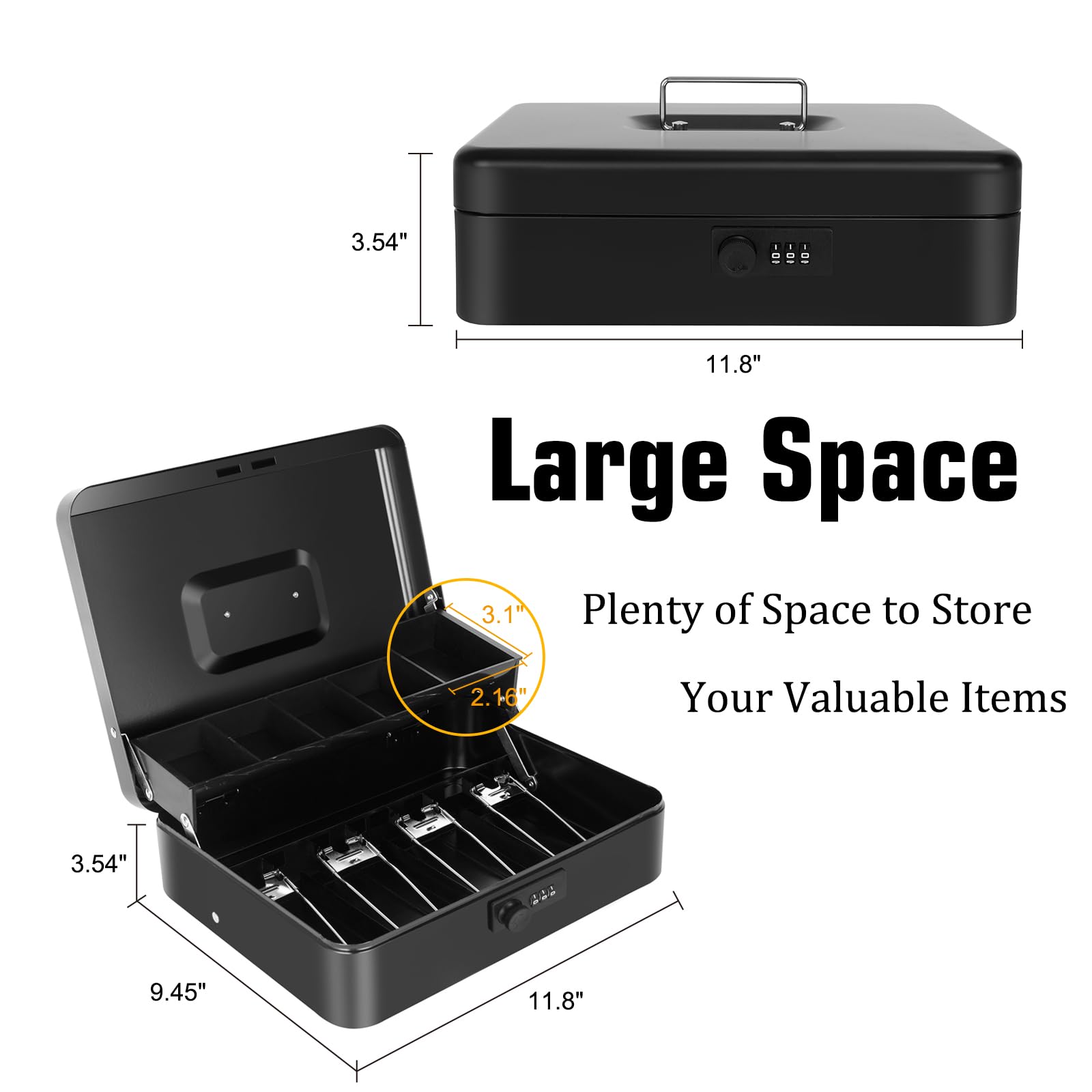 SECURE CASH BOX: Our cash box with combination lock is designed with two tiers, the coin tray has five slots comes over the cashbox when it's opened, below the coin tray is the cash storage area with four slots, along with extra space at the bottom for storing checks, receipts, coin rolls, etc. Making it a well designed lock box to keep your valuables safe and well organzied.