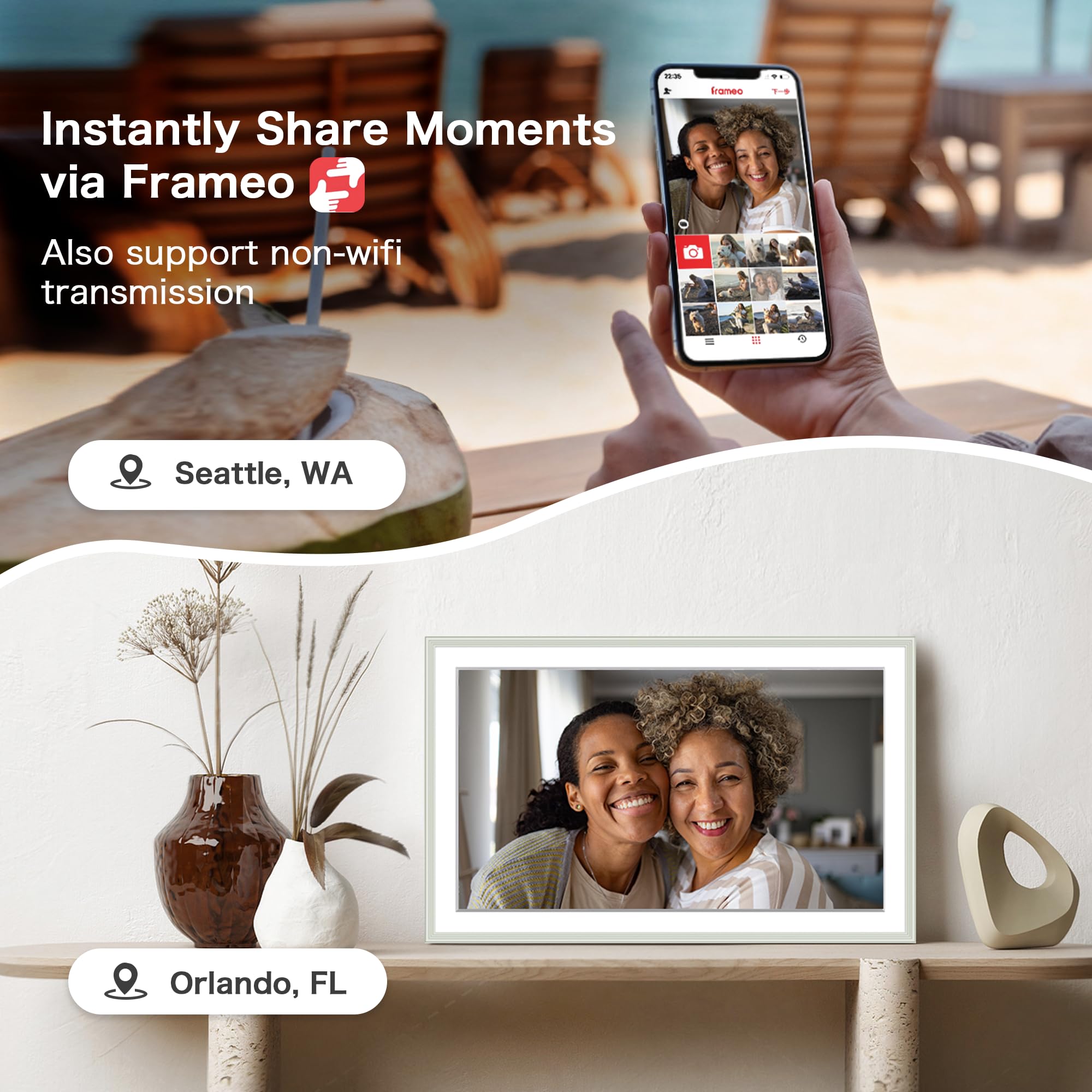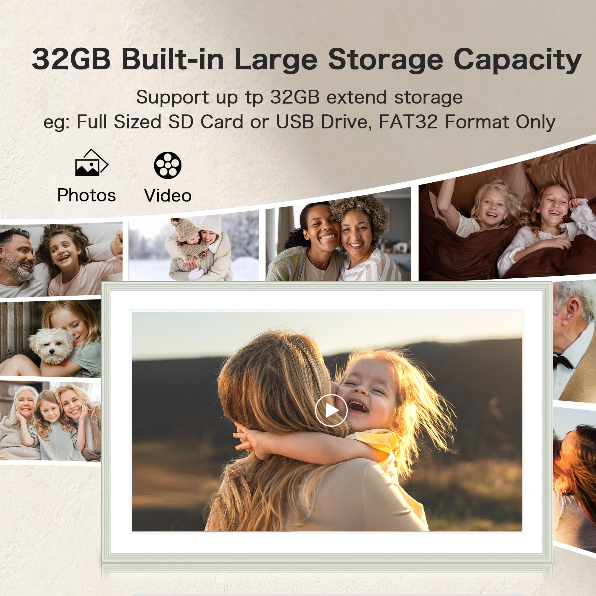 Instant Share via Frameo APP; Connect your picture frames to WIFI, and share photos and videos(Max.15s) quickly via a reliable App- Frameo to our electronic picture frame from anywhere, privately and safely, no member numbers limited. Compatible with Frameo APP, no extra app needed. Our digital picture frame wifi has 32GB built-in memory and support up to 32GB external storage, enables you to share 50,000+ photos. Also, you can transfer via external storage or through a computer, no Wi-Fi needed