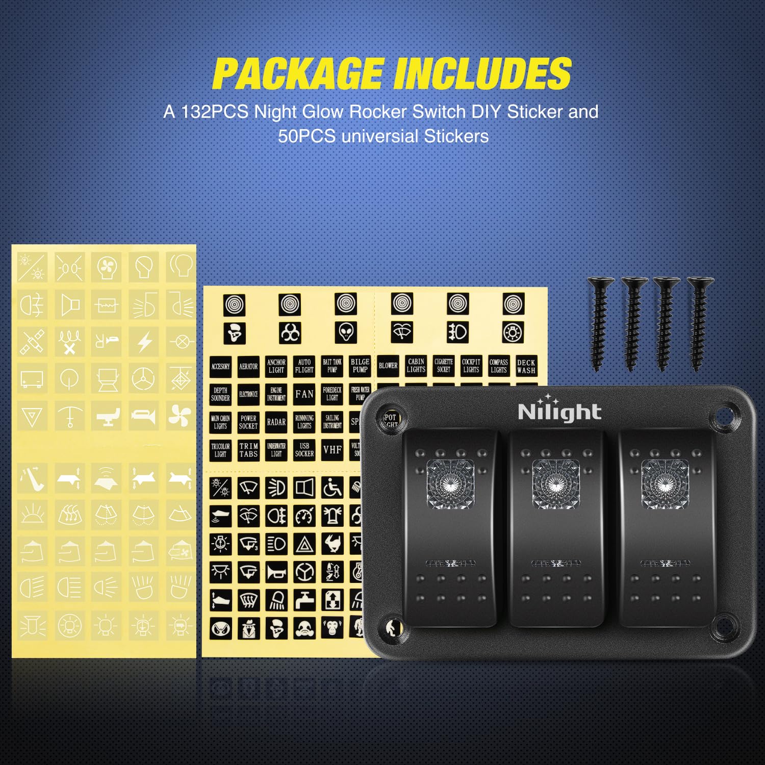 3 gang rocker switch aluminum panel with DIY sign stickers can customize these switches as your demands to remind you while using With pre-wired wiring harness for you to easily install in both 12 volt and 24 volt vehicle yacht ship caravan truck etc.