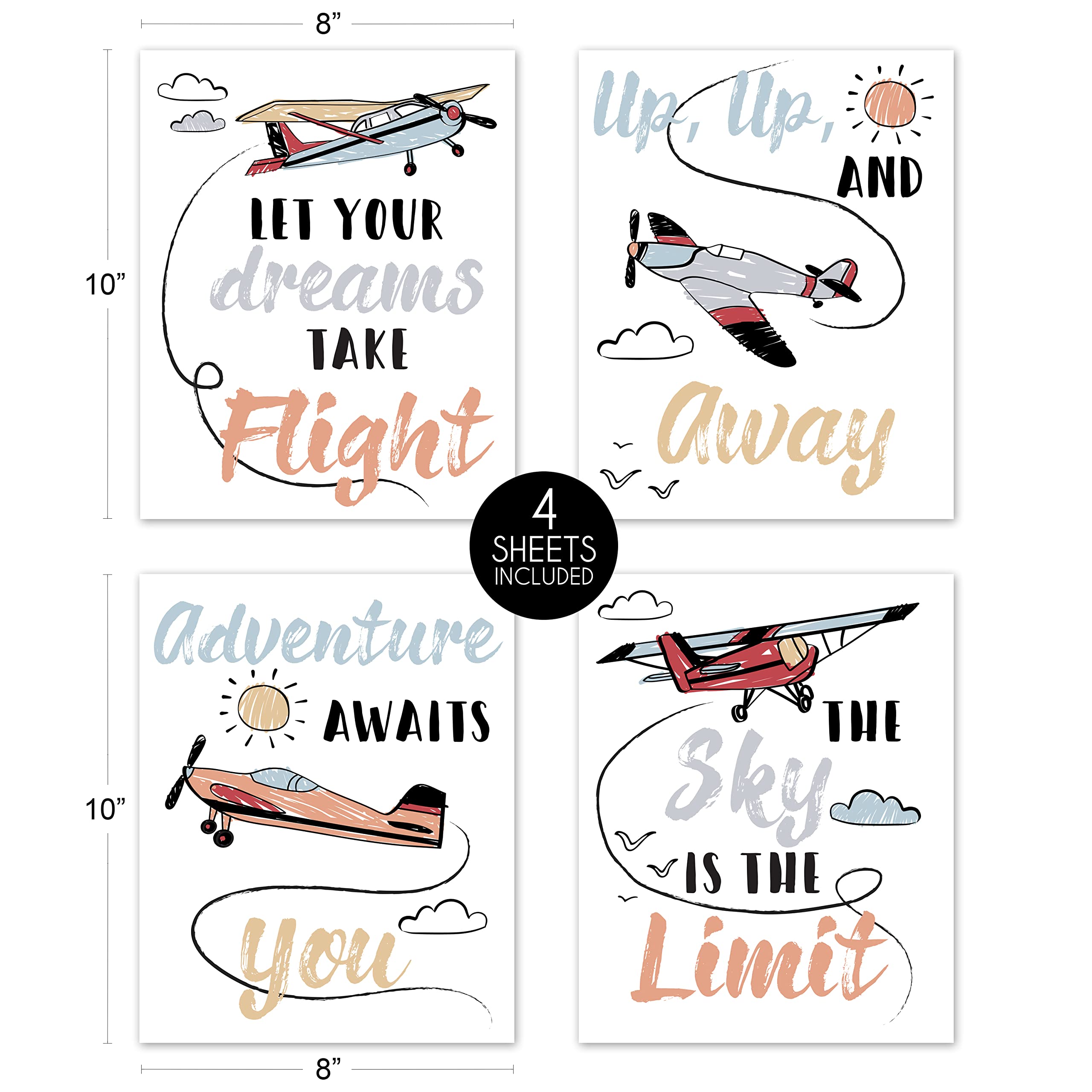 Decorative wall art print set features vintage airplanes with inspirational "Let Your Dreams Take Flight", "Up, Up, and Away", "Adventure Awaits You" and "The Sky is the Limit" quotes.