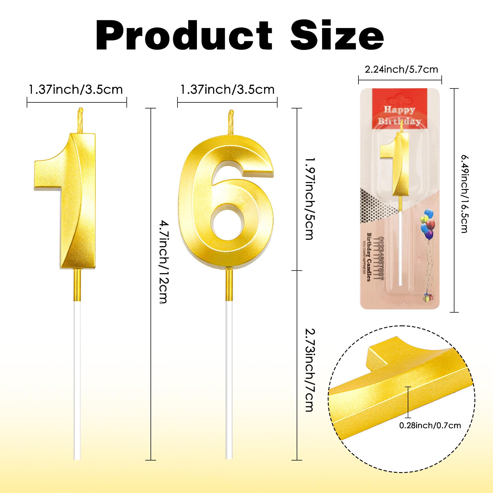 Birthday Candle Size: Each numeral birthday candle height measures about 1.97inch/6 cm, total height(include the candle pick) is approx. 4.7 inch/12 cm, width: 1.37 inch/3.5 cm, thickness: 0.28 inch/0.7 cm. The size is good, appropriate size can be applied as cake topper decoration for most birthday and wedding cake