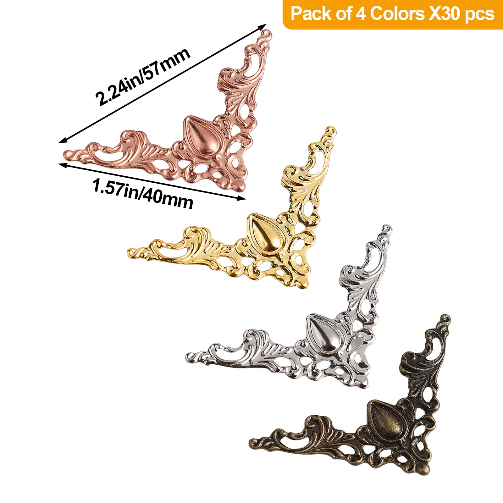 Package includes 120 pcs of decorative metal book corner in 4 colors. a