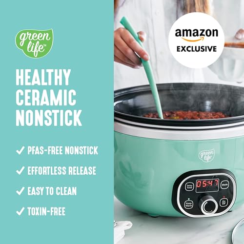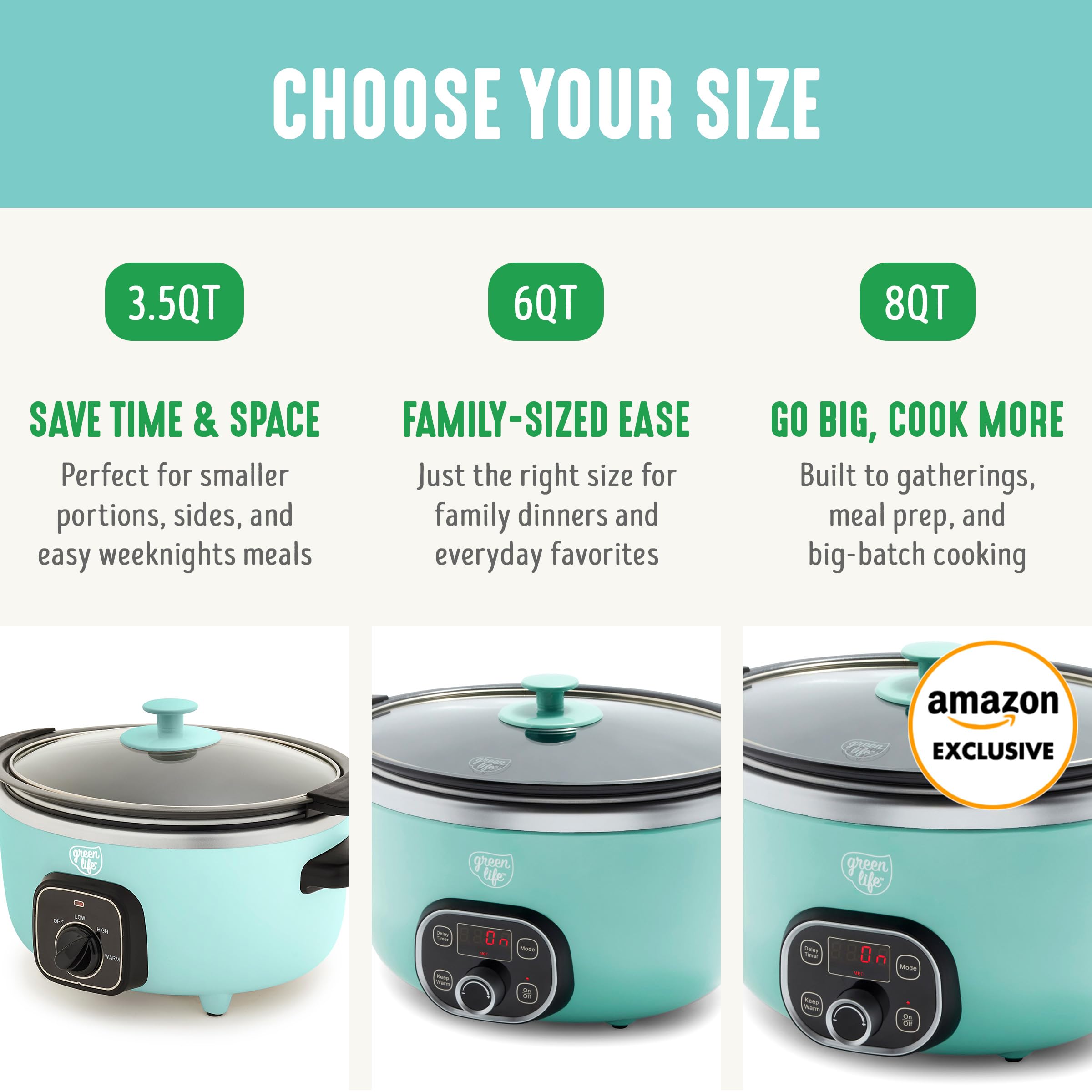 The GreenLife 8QT Slow Cooker makes it easy to create delicious meals for the whole family. The extra deep pot is perfect for big-batch soups, hearty stews, game-day chili, and crowd-pleasing mains — all with plenty to share. The removable pot is stovetop and oven safe, so you can sear, sauté, or brown your ingredients before slow cooking them to tender perfection. GreenLife’s signature healthy ceramic nonstick coating makes cleanup effortless and is PFAS-free for healthier meals every day. The simple control dial offers Low, High, and Warm settings to match your recipe and schedule, while the clear glass lid lets you check on your meal without losing heat. When it’s time to serve, switch to Warm to keep your food fresh and ready. And when the feast is over, both the pot and lid are dishwasher safe for an easy cleanup.