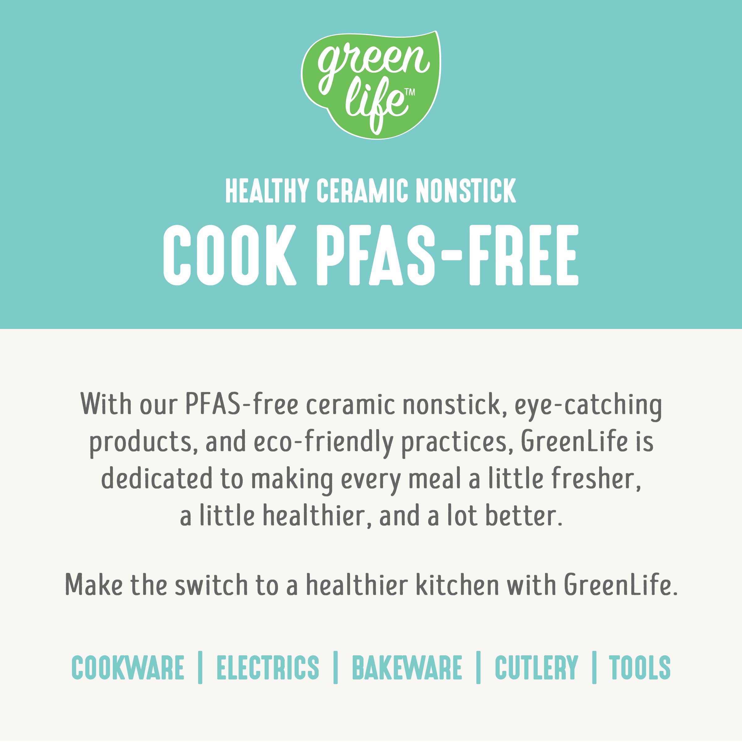 TOXIN-FREE CERAMIC NONSTICK INTERIOR: GreenLife’s PFAS-free ceramic nonstick coating is derived from sand and delivers effortless release with quick cleanup and delivers endless, worry-free meals.