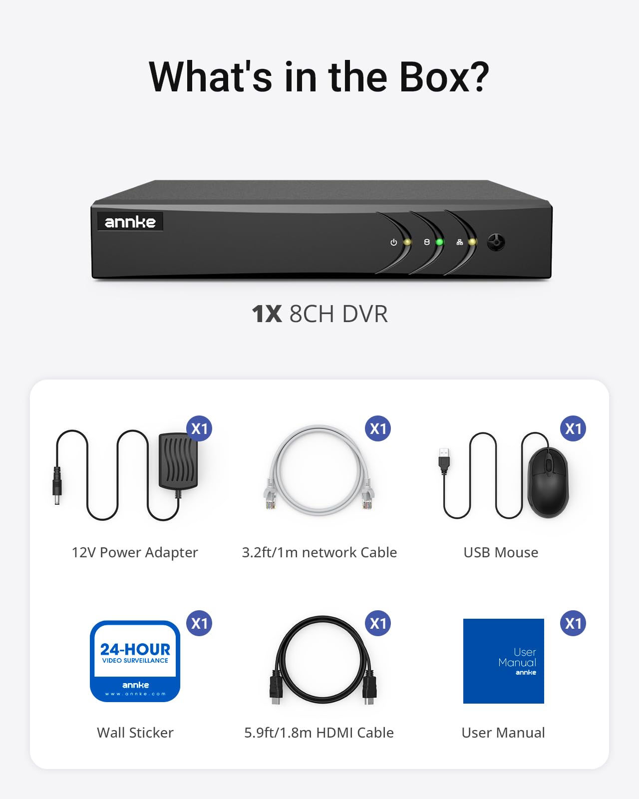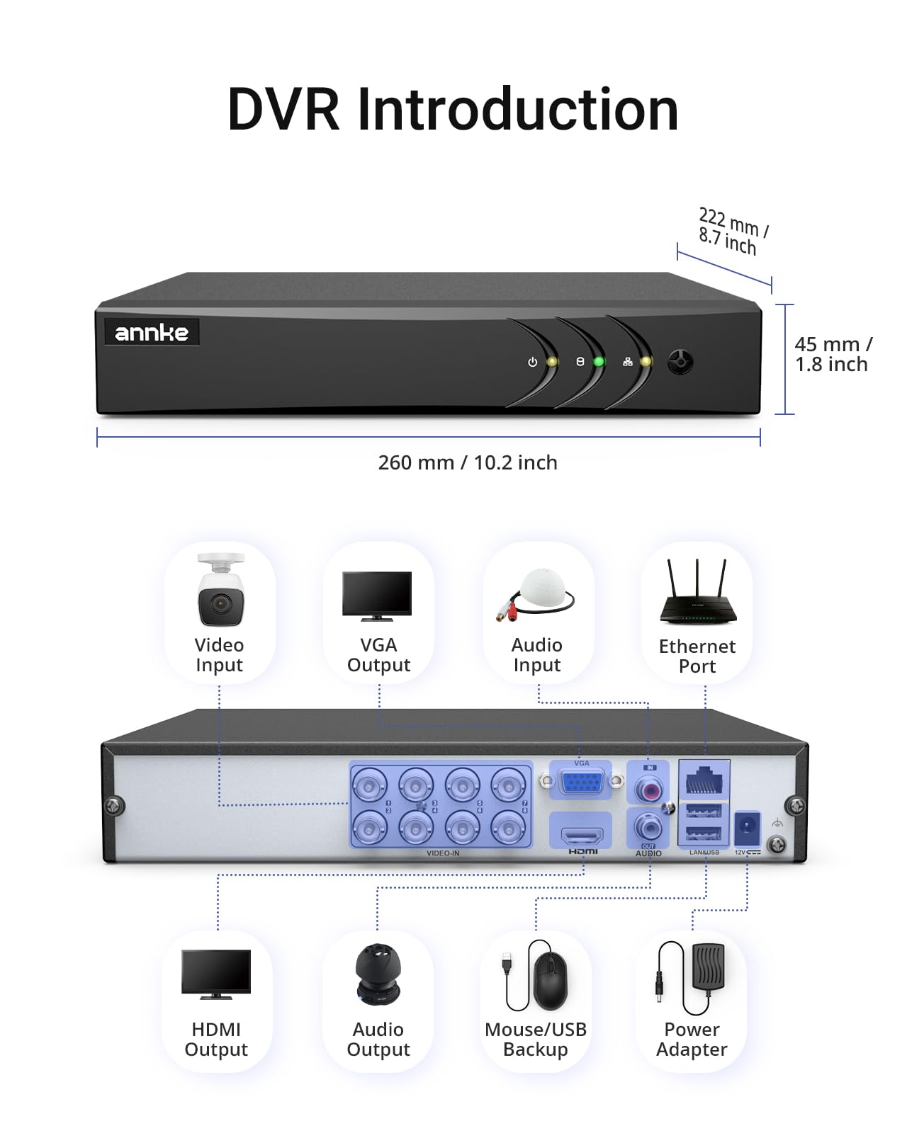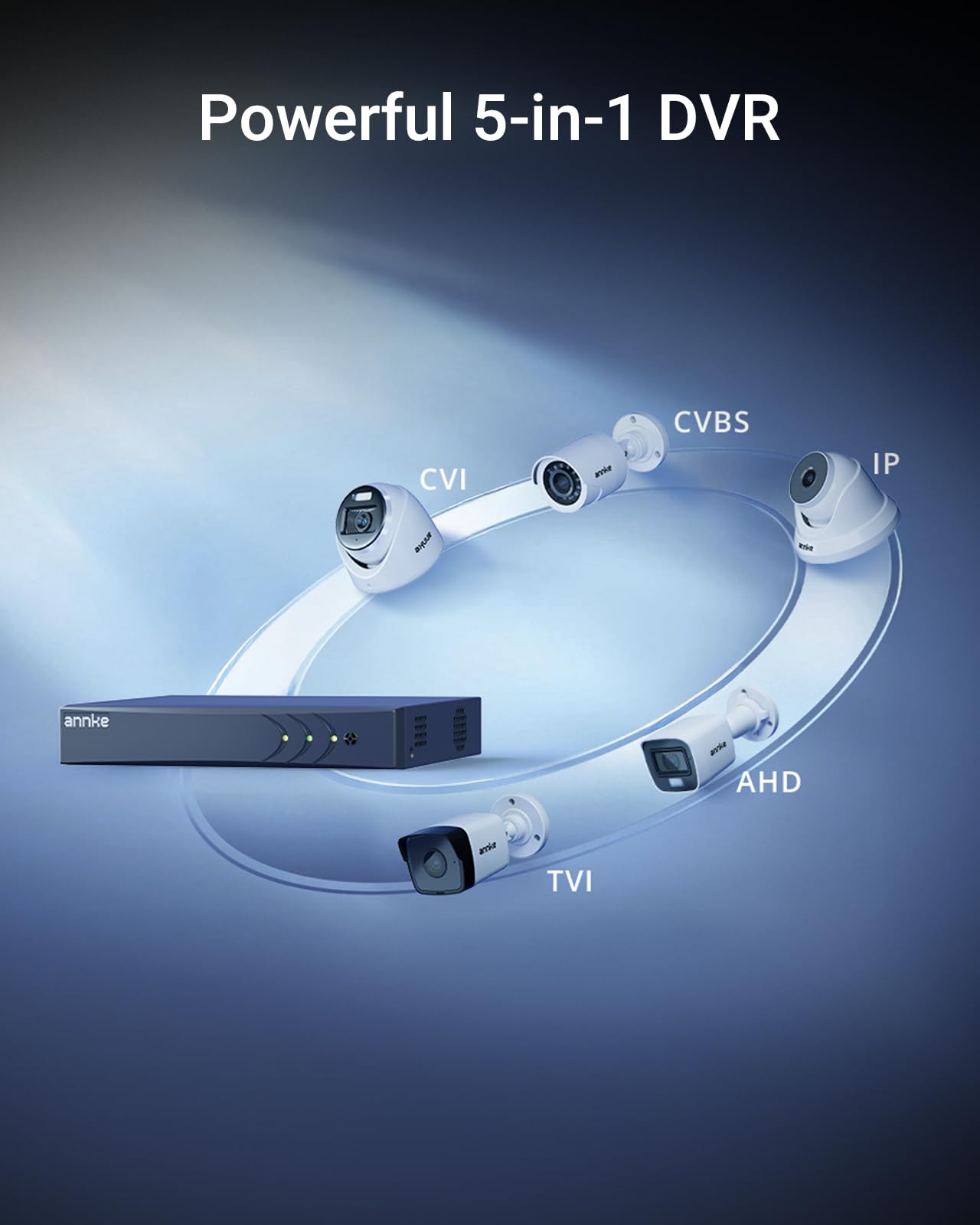 5-in-1 Hybrid DVR – The expandable DVR combines the features of DVR/NVR/HVR, supports up to 8 pcs TVI, AHD, CVI, CVBS & extra 2 IP cameras. Note: This DVR is recommended to be used in conjunction with ANNKE cameras for an enhanced user experience.