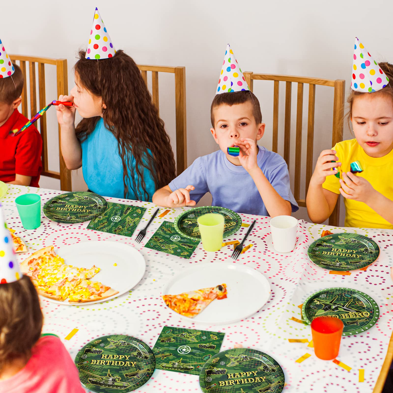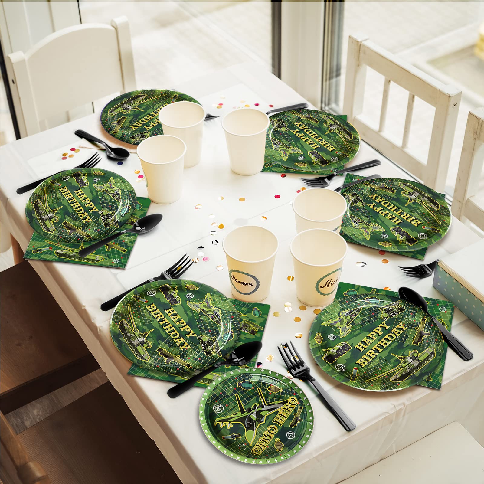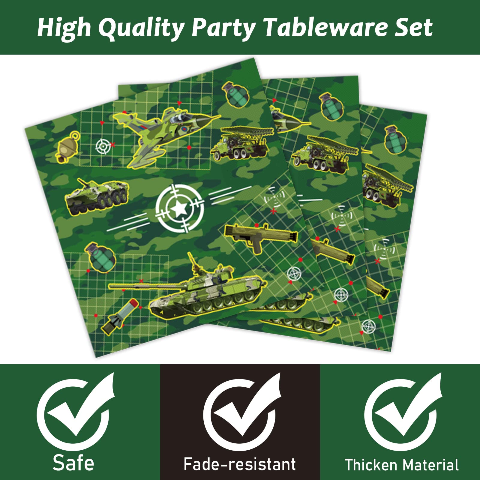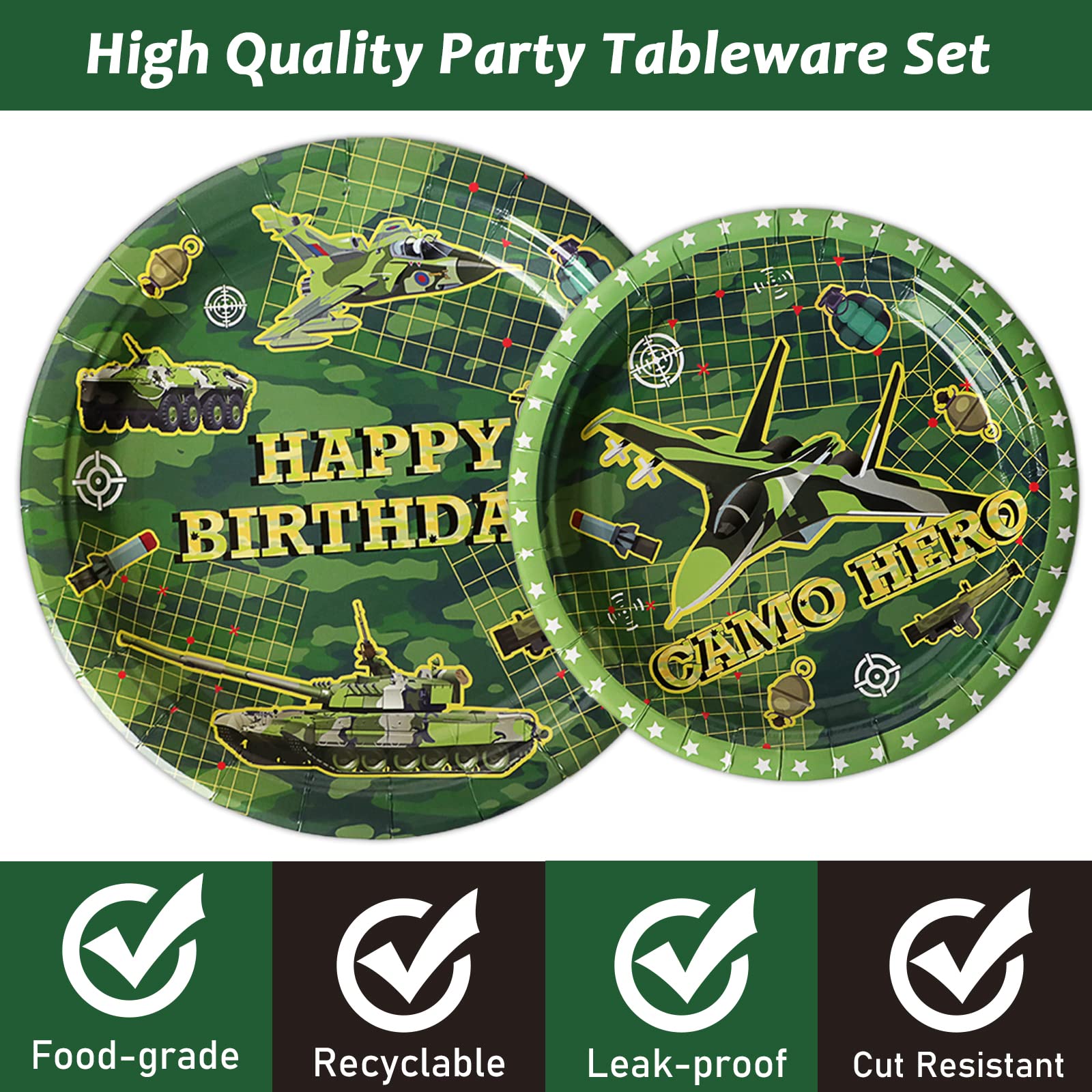【Army Party Table Settings】These army party tableware kit can serve 24 guests, an enough quantity for a normal army theme big day. These army party decoration kit will make your table settings look fantastic and all your guests will be happy.