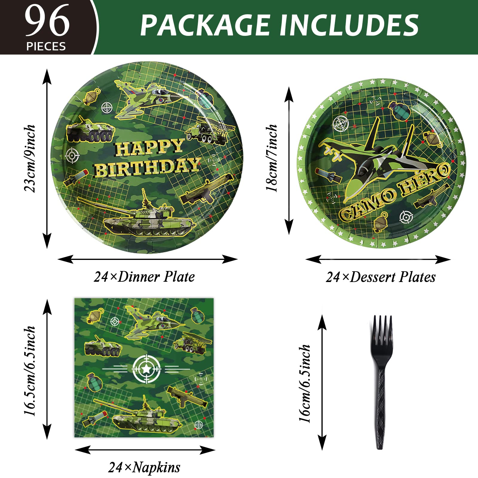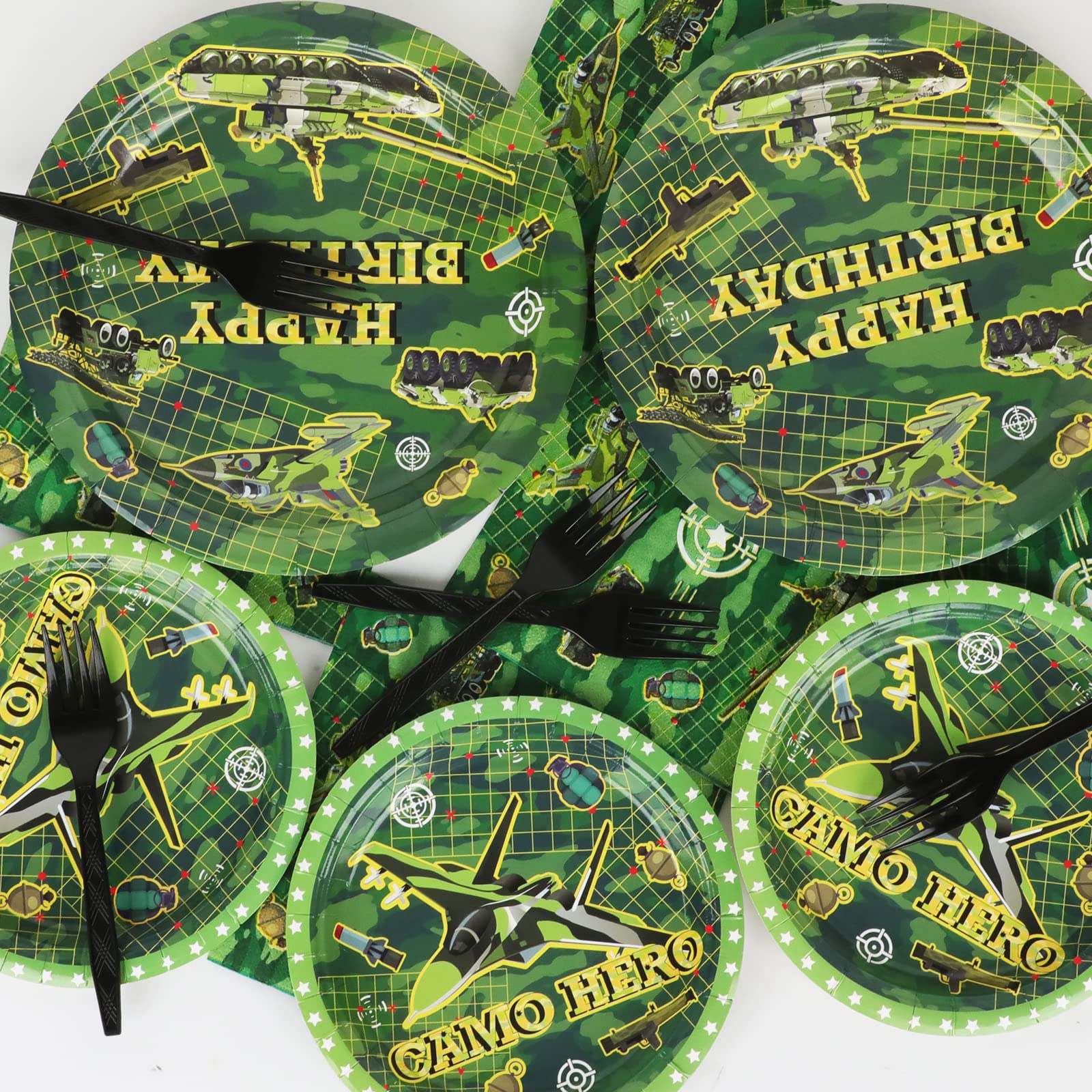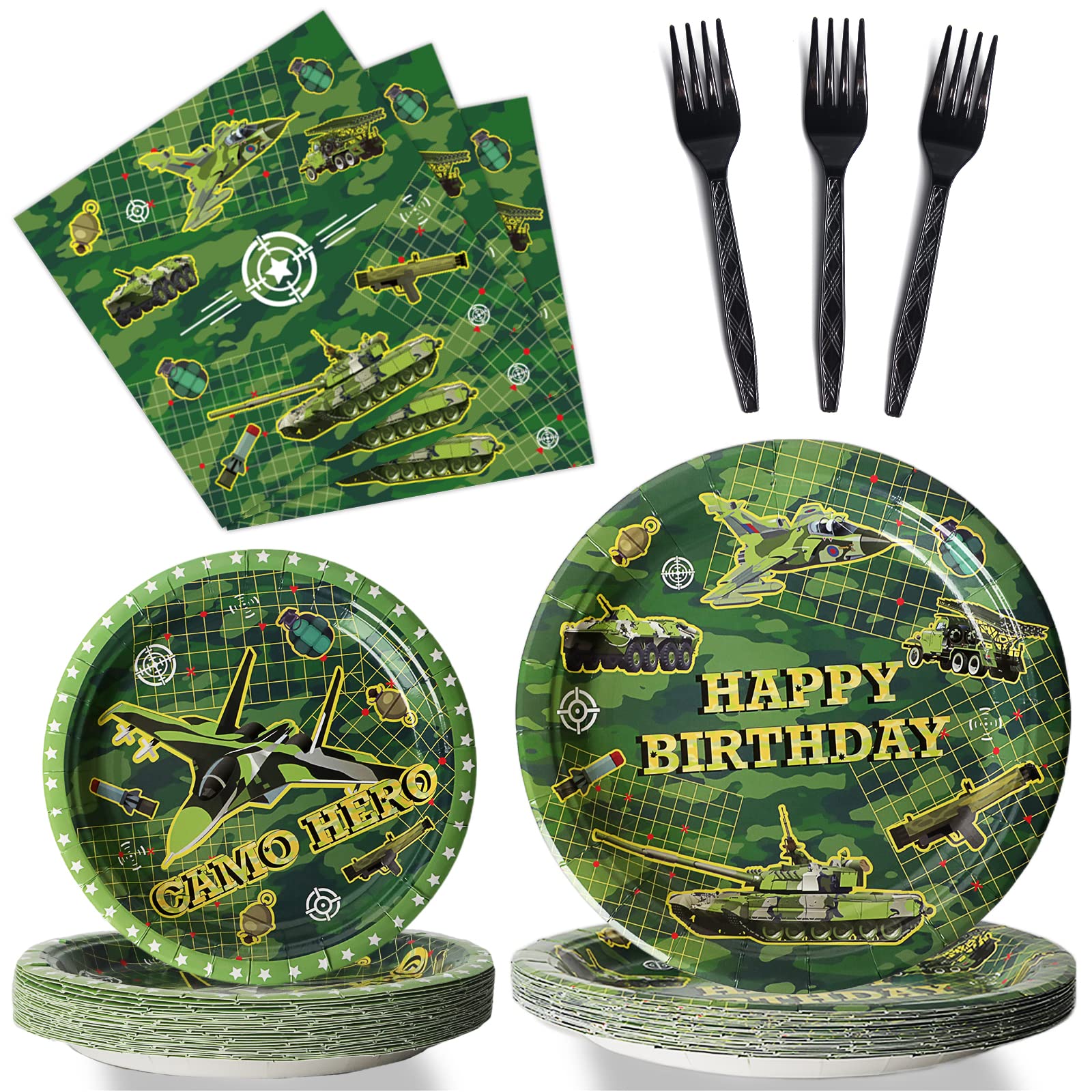 【Camouflage Happy Birthday Party Supplies】You will receive 24 pieces camouflage happy birthday paper dinner plates of 9’’, 24 pieces plates of 7’’, 24 pieces camo birthday napkins of 6.5’’ and 24 plastic black forks for each set that can serve 24 guests.