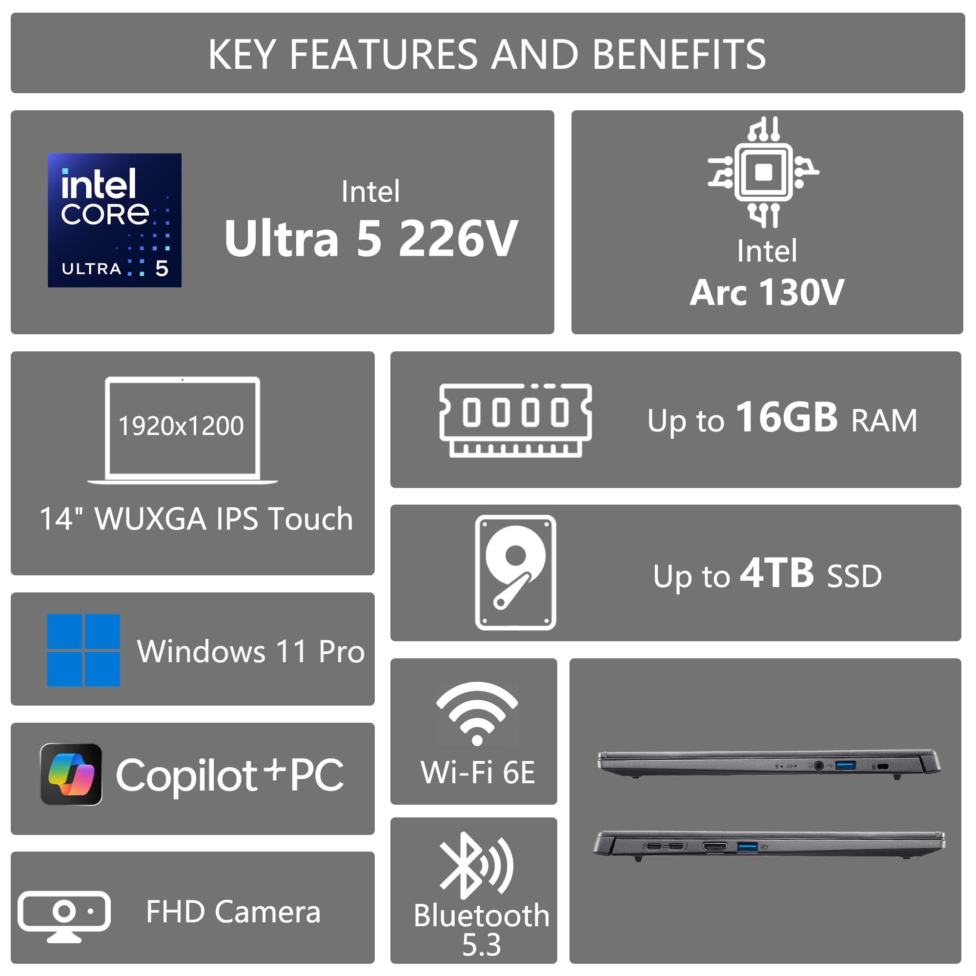 PRODUCT OVERVIEW: KEY SPECIFICATIONS: PC Type: Portable Business Laptop Computer PC Series: Acer Aspire 14 AI Processor: Intel 8-core Ultra 5 226V Processor Memory: 16GB DDR5 Storage: 1TB SSD Graphics: Integrated Intel Arc 130V GPU Display: 14" WUXGA (1920 x 1200) IPS ComfyView Matte Touchscreen Communications: Wi-Fi 6E, Bluetooth 5.3 Camera: FHD Webcam Operating system: Windows 11 Professional Ports & Slots: 2 x USB-A 3.2, 1 x Type-C 4, 1 x HDMI Battery: 65Wh Additional Information: Dimensions: 8.9" x 12.6" x 0.67" Approximate Weight: 3.1 pounds
